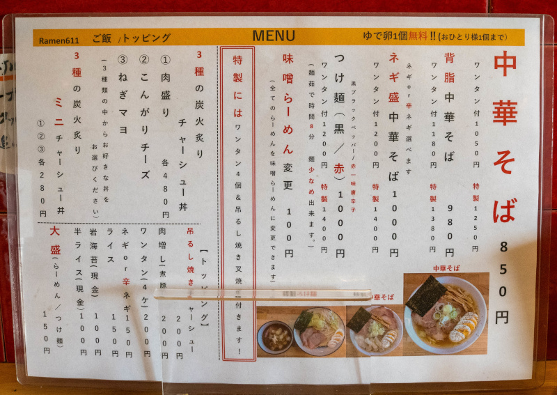 背脂 中華そば 980 ネギ盛 中華そば 1000 つけ麺 黒/赤 1000 大盛 +150 味噌らーめん変更 +100 【限定メニュー】(抜粋)