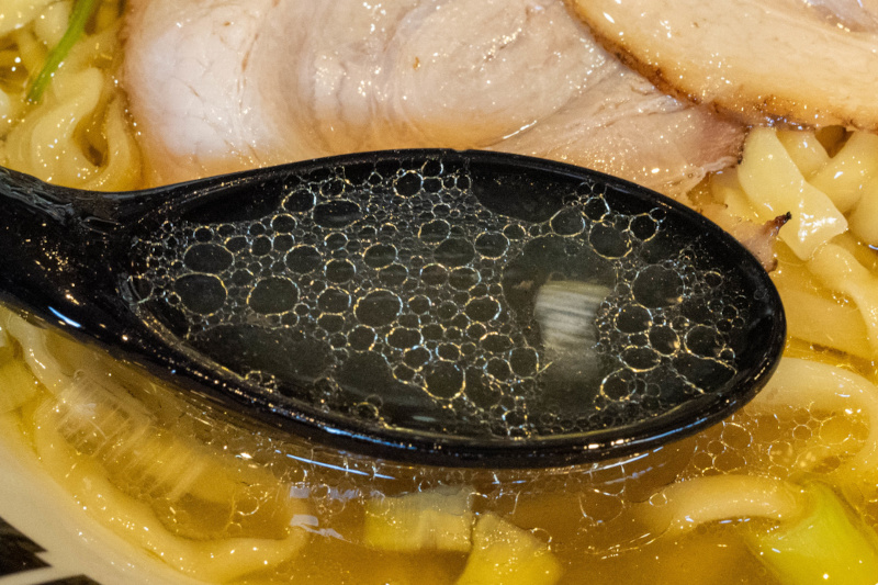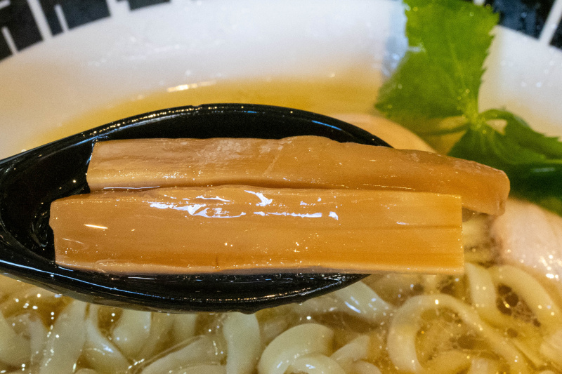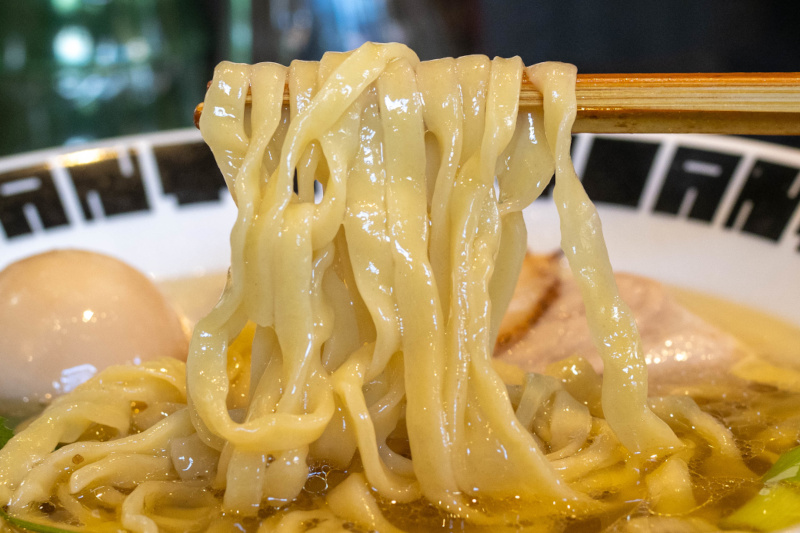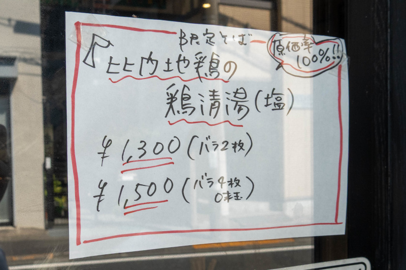 POPには 『原価率 100%』とある。本当にありがとうございます。 アニバーサリーウィークの週末は、最強の地鶏、比内地鶏を存分に。 土曜日は清湯、日曜日は白湯。 各日30食のみです。 宜しくお願い致します。 黄色みを帯びたスープには、比内地鶏の旨味と鶏油の甘みが凝縮されている。 塩加減は絶妙で、鶏油はたっぷりながらもしつこさはなく、最後まで飽きずに美味しさを楽しめる。 麺は、今後中華そばに使用予定のもの。 太めの平打ちで、軽くウェーブがかかっている。 ツルツルとした啜り心地に加え、もち麦を50%使用したことで生まれる強い弾力とモチッとした食感が魅力。 小麦の甘みもしっかり感じられ、スープとの相性も抜群。 (村上朝日製麺) チャーシューは炭火で焼き上げた豚バラロールが2枚。 炭火の香ばしさが旨味を引き立て、脂はほどよく入り、しなやかで上質な仕上がり。 味玉は、黄身がとろりとした半熟で、白身は全体にしっかりと色づいている。 濃厚な黄身の旨みが際立ち、美味しさを引き立てている。 メンマは太く、硬めでコリコリとした食感。 薬味は、長ネギの小口切り、三つ葉。 今年も常連さんからの差し入れ、ありがたい! 比内地鶏の旨味がたっぷりと染み出した極旨の一杯! |