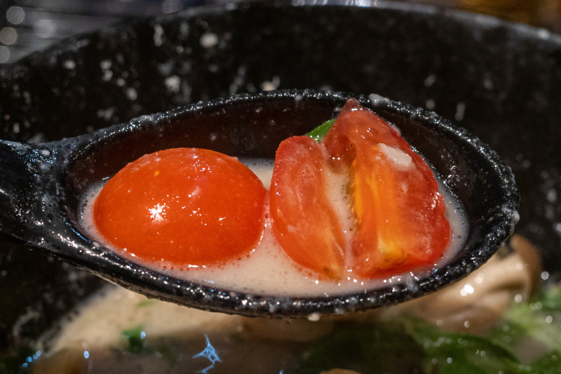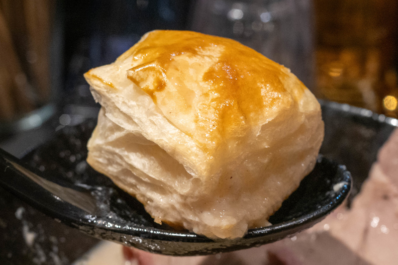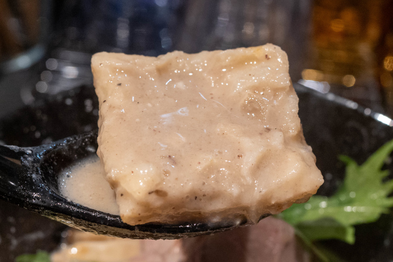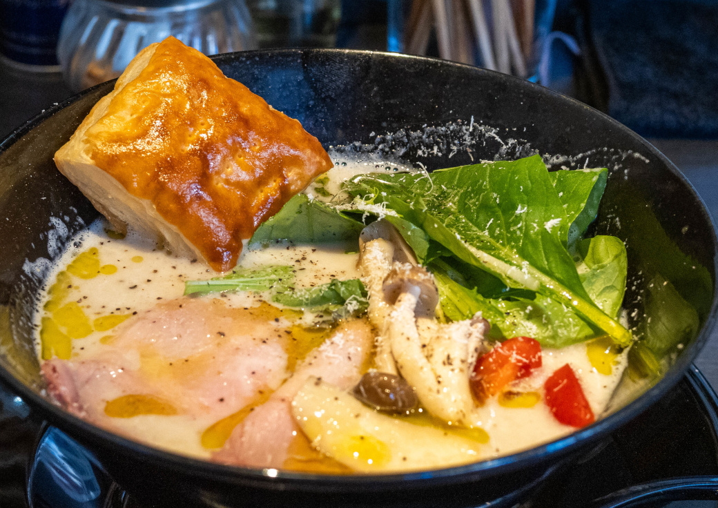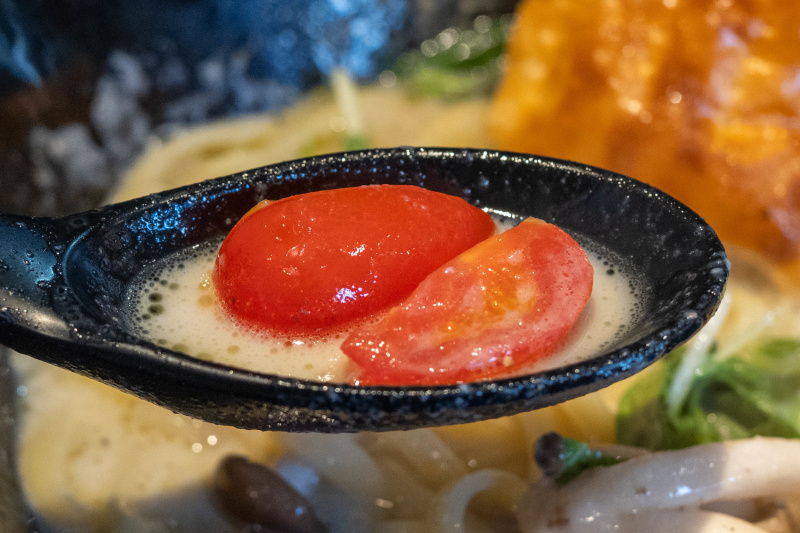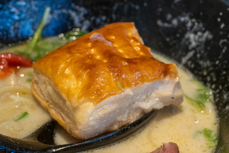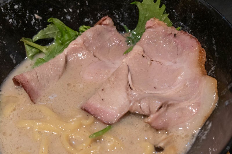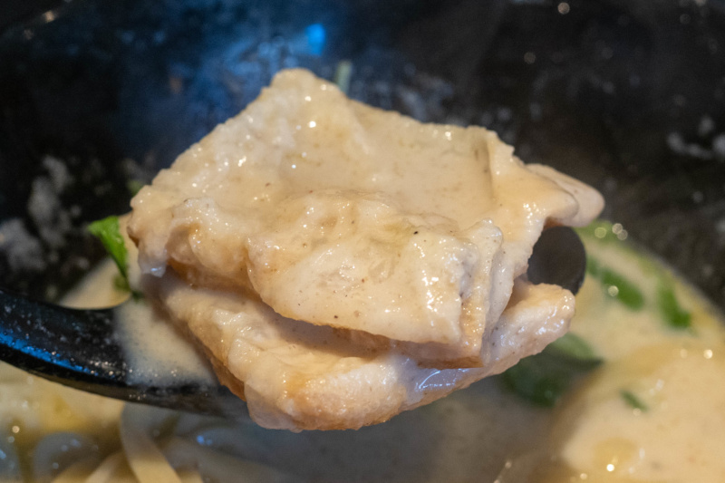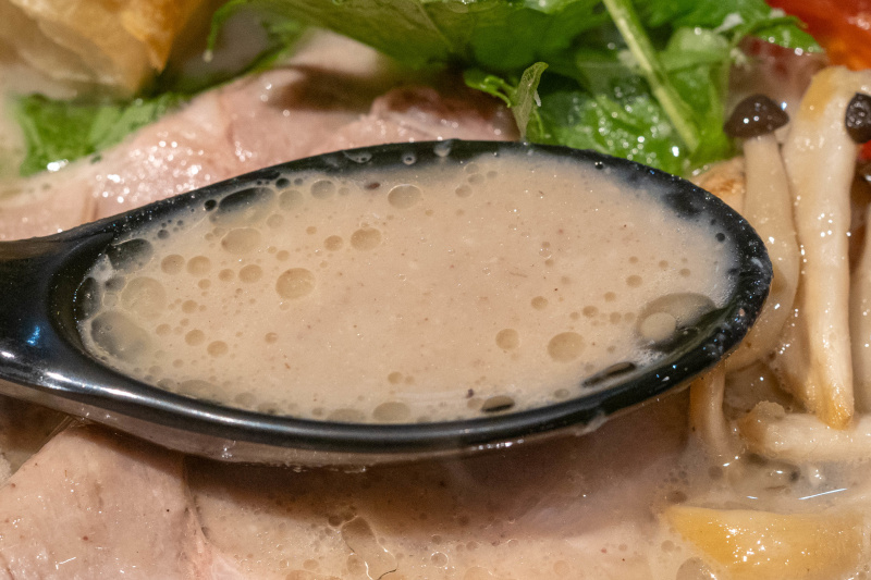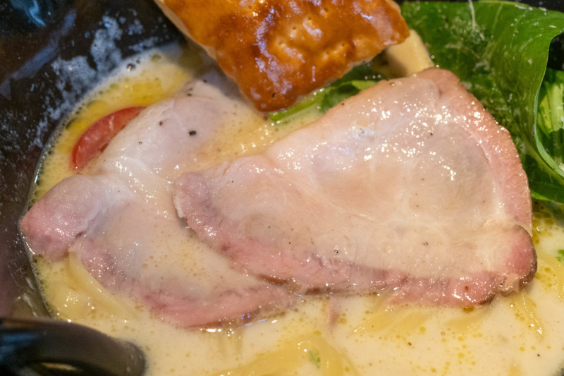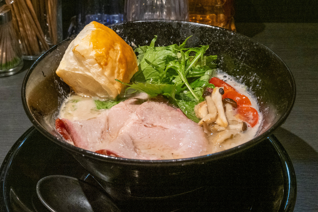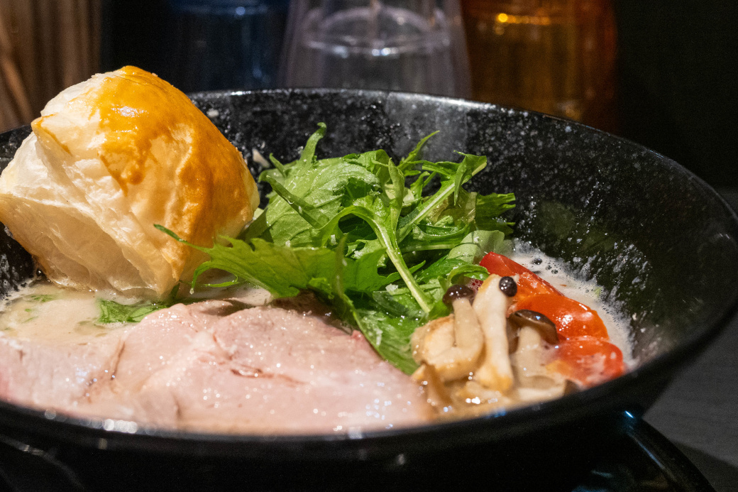 白茶濁のとろみのあるスープは、キノコポタージュ×濃厚豚骨スープ。 キノコの旨味がたっぷりのスープに、トリュフオイルの芳醇で高級感のある香りで、とても美味しい。 麺は、中華そばに使用している太めの平打ちで、手揉みを加えていないストレート。 ツルツルとした啜り心地に加え、もち麦を50%使用したことで生まれる強い弾力とモチッとした食感が魅力。 小麦の甘みもしっかり感じられ、スープとの相性も抜群。 キノコポタージュスープと合わせると、パスタに近い食感に感じられる。 (村上朝日製麺) チャーシューは炭火で焼き上げた豚肩ロースが2枚。 炭火の香ばしさが旨味を引き立て、脂はほどよく入り、しなやかで上質な仕上がり。 自家製のパイは焼きたてだそうで、ふっくらと香ばしい。 キノコポタージュスープに浸しても抜群に美味しい。 その他の具は、キノコ(シメジ、エリンギ)のソテー、プチトマト、ベビーリーフ。 この限定メニューのために、丼を新調したのだそう。 手が込んでいて、レベルの高い洋風ラーメン! |