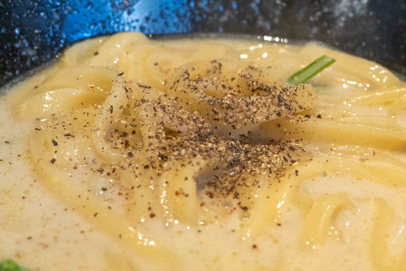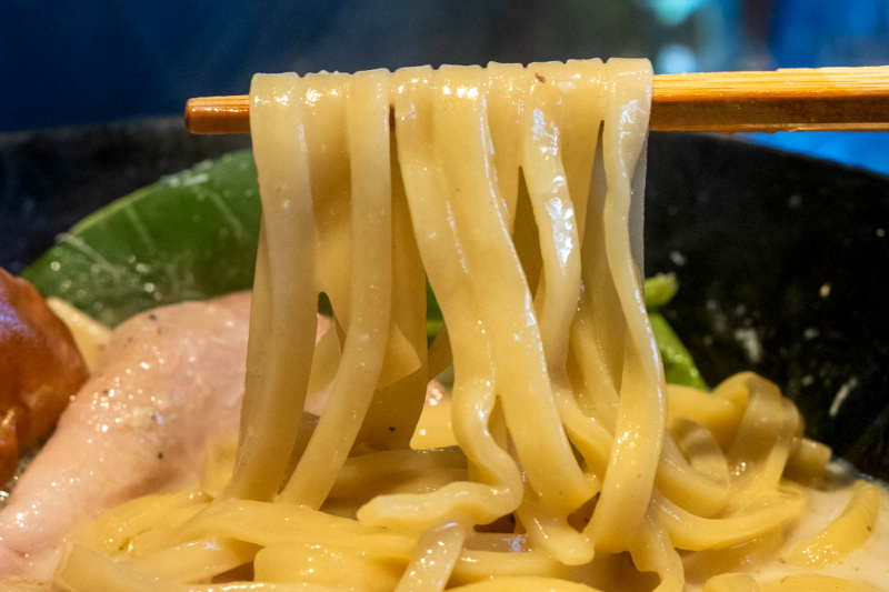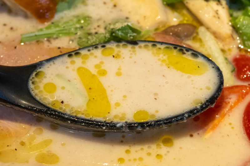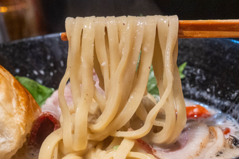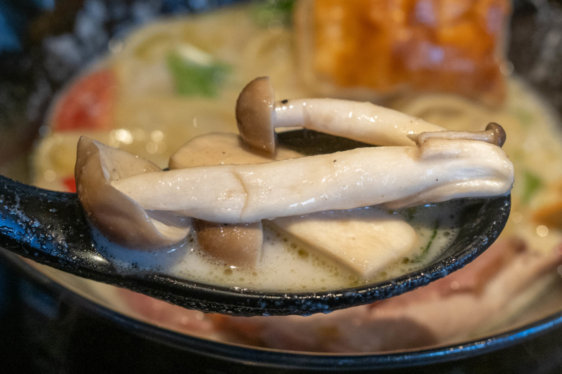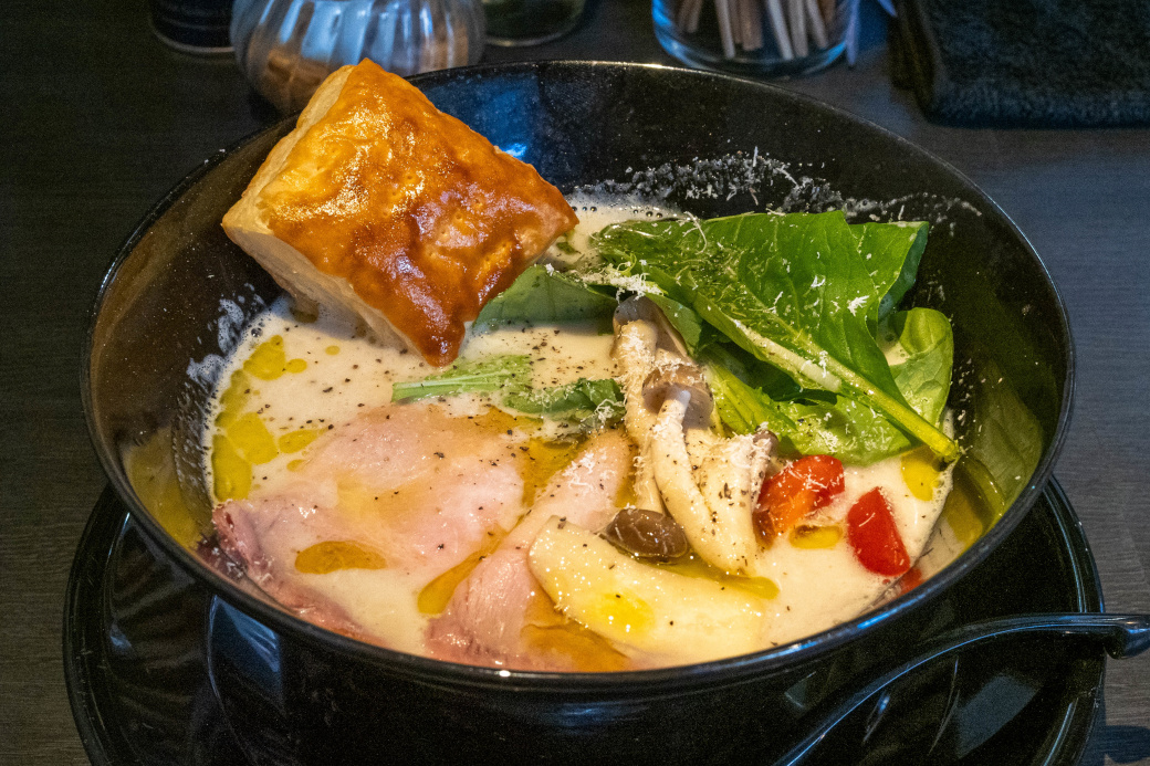 (以前と同じ印象はコピペ) 白茶濁のとろみのあるスープは、キノコポタージュ×濃厚豚骨スープ。 キノコの旨味がたっぷりのスープに、トリュフオイルの芳醇で高級感のある香りで、とても美味しい。 麺は、中華そばに使用している太めの平打ちで、手揉みを加えていないストレート。 ツルツルとした啜り心地に加え、もち麦を50%使用したことで生まれる強い弾力とモチッとした食感が魅力。 小麦の甘みもしっかり感じられ、スープとの相性も抜群。 キノコポタージュスープと合わせると、パスタに近い食感に感じられる。 (村上朝日製麺) チャーシューは炭火で焼き上げた豚肩ロースが2枚。 炭火の香ばしさが旨味を引き立て、脂はほどよく入り、しなやかで上質な仕上がり。 自家製のパイは焼きたてだそうで、ふっくらと香ばしい。 キノコポタージュスープに浸しても抜群に美味しい。 その他の具は、キノコ(シメジ、エリンギ)のソテー、プチトマト、ベビーリーフ。 この限定メニューのために、丼を新調したのだそう。 手が込んでいて、レベルの高い洋風ラーメン! |