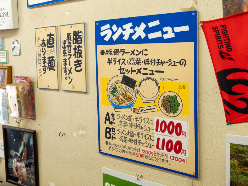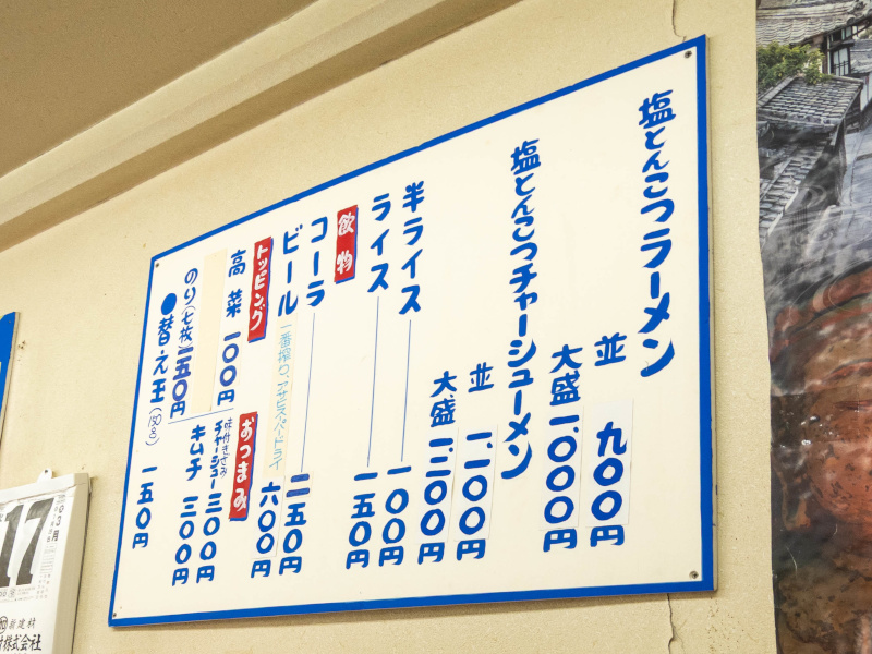 ビール(一番搾り・スーパードライ) 500 コーラ 250 ---------- (以前のメニュー) [2024/6/3] ※ 直麺(ストレート麺)あり、脂抜き可 塩とんこつラーメン 並 800 / 大盛 900 塩とんこつチャーシューメン 並 1000 / 大盛 1100 替玉 150g 150 《トッピング》 高菜 100、のり 7枚 150 《ランチメニュー》 ※ チャーシューメンは+200、半ライス⇒並ライス変更は+50 Aセット ラーメン並+半ライス+高菜・味付チャーシュー 900 Bセット ラーメン大盛+半ライス+高菜・味付チャーシュー 1000 ライス 150・半ライス 100 《おつまみ》 味付きざみチャーシュー 300、キムチ 300 ビール(一番搾り・スーパードライ) 500 コーラ 250 [2021/3/5] 塩とんこつラーメン 並 700 / 大盛 800 塩とんこつチャーシューメン 並 900 / 大盛 1000 替玉 150 《トッピング》 高菜・ゆでタマゴ 50、のり 7枚 100、完全根切りモヤシ大盛 200 《ランチメニュー 11:30~15:00》 ※ チャーシューメンは+300、半ライス⇒並ライス変更は+50、夜は+50 Aセット ラーメン並+半ライス+高菜・味付チャーシュー 700 Bセット ラーメン大盛+半ライス+高菜・味付チャーシュー 800 ライス 150・半ライス 100 《おつまみ》 味付きざみチャーシュー200、キムチ 200 ビール(キリン一番搾り 中ビン) 600、生冷酒(大分県臼杵市の地酒 300ml) 600 コーラ 150 [2010/9/14] 塩とんこつラーメン 並 600・大盛 700 塩とんこつチャーシューメン 並 800・大盛 900 替玉 150 【トッピング】 高菜・ゆでタマゴ・のり 7枚 50、モヤシ大盛 100 ライス 150・半ライス 100 【ランチメニュー 11:30~15:00】 チャーシューメンは+200、半ライス⇒並ライスは+50、夜は+50 Aセット ラーメン並+半ライス+高菜・味付チャーシュー 700 Bセット ラーメン大盛+半ライス+高菜・味付チャーシュー 800 【おつまみ】 味付きざみチャーシュー100、キムチ 100 ビール(キリン一番搾り 中ビン) 500、オレンジジュース・コーラ 150 |