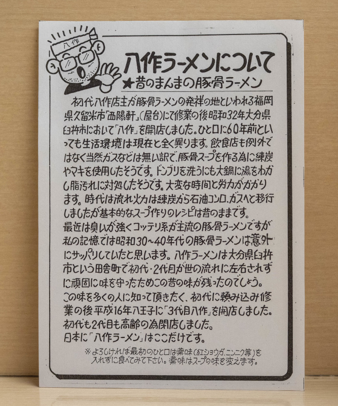 時代は流れ火力は練炭から石油コンロ、ガスへと移行しましたが基本的なスープ作りのレシピは昔のままです。 最近は臭いが強くコッテリ系が主流の豚骨ラーメンですが、私の記憶では昭和30~40年代の豚骨ラーメンは意外にサッパリしていたと思います。 八作ラーメンは大分県臼杵市という田舎町で初代・2代目が世の流れに左右されずに頑固に味を守ったためこの昔の味が残ったのでしょう。この味を多くの人に知って頂きたく、初代に頼み込み修業の後、平成16年八王子に「3代目八作」を開店しました。 初代も2代目も高齢の為閉店しました。 日本に「八作ラーメン」はここだけです。 [*] 西陽軒 ⇒ 清陽軒 が正しいと思われる、清陽軒の創業は昭和27年(1952年) |