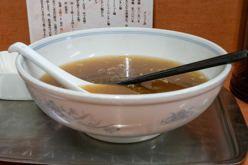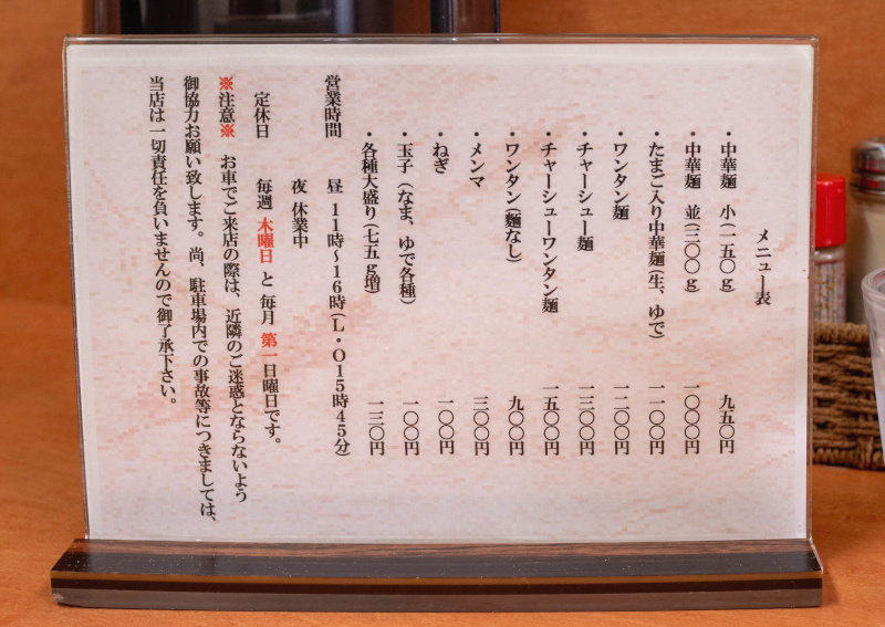 (以前のメニュー) [2023/8/7] 2023/8/7 価格改定 中華麺 小 150g 900 中華麺 並 300g 950 たまご入り中華麺(生/ゆで) 1050 ワンタン麺 1150 チャーシュー麺 1250 チャーシューワンタン麺 1450 ワンタン(麺なし) 850 メンマ 300、ねぎ 100、玉子(生/ゆで) 100 [2023/6/14] ※ 麺の量 : 通常(2玉) 300g / 少なめ(1.5玉) 225g / 小(1玉) 150g -50 / 大盛り 75g増 +130 【中華麺】 中華麺 小 150g 850 中華麺 並 300g 900 たまご入り中華麺(生/ゆで) 950 ワンタン麺 1050 チャーシュー麺 1150、チャーシューワンタン麺 1300 ワンタン 700 大盛り +130 メンマ 280、ねぎ 80、玉子(なま、ゆで各種) 50 [2019/7/15] 【中華麺】 ※ 麺の量 : 通常(2玉) 300g / 少なめ(1.5玉) 225g / 小(1玉) 150g -50 / 大盛り 75g増 +120 中華麺 850、ゆで玉子入り中華麺 900、なま卵入り中華麺 900、ワンタン麺 1000、チャーシュー麺 1050、チャーシューワンタン麺 1200 ワンタン 700 【つけ麺】 ※ つけ中華麺は4~9月の提供、麺の硬さの指定は不可 大盛り(150g増) +240 つけ中華麺 [2012/4/28] [2017/7/11] [2019/8/11] 880、ゆで玉子付きつけ中華麺・なま卵付きつけ中華麺 930、のり付き(8枚)つけ中華麺 980、チャーシューつけ中華麺 1080 お子様用つけスープ 240 メンマ 250、ねぎ 70、玉子(なま、ゆで各種) 50 [2017/1/22] 中華麺 800、ゆで玉子入り中華麺 ・なま卵入り中華麺 850、ワンタン麺 950、チャーシュー麺 1000、チャーシューワンタン麺 1150、ワンタン 650、メンマ 240 【限定メニュー】 2017/4/24~ (2017/9/30で提供終了) つけ中華麺 850、ゆで玉子付きつけ中華麺・なま卵付きつけ中華麺 900、のり付き(8枚)つけ中華麺 950、チャーシューつけ中華麺 1050 大盛り(150g増) +240、お子様用つけスープ 240 [2009/12/30] 中華麺 750、ゆで玉子入り中華麺・なま卵入り中華麺 800、ワンタン麺 900、チャーシュー麺 950、チャーシューワンタン麺 1100、ワンタン 600、メンマ 200 大盛り(75g増) +100 (つけ中華麺は4~9月の提供。麺の硬さの指定は不可) つけ中華麺 800、のり付きつけ中華麺・ゆで玉子付きつけ中華麺・なま卵付きつけ中華麺 850、チャーシューつけ中華麺 1000 メンマ 200 大盛り(150g増) +200、お子様用つけスープ 200 [2008/2/11] 中華麺 700、ゆで玉子入り中華麺・なま卵入り中華麺 750、ワンタン麺 850、チャーシュー麺 900、チャーシューワンタン麺 1050 ワンタン 550、メンマ 200 大盛り +100 |