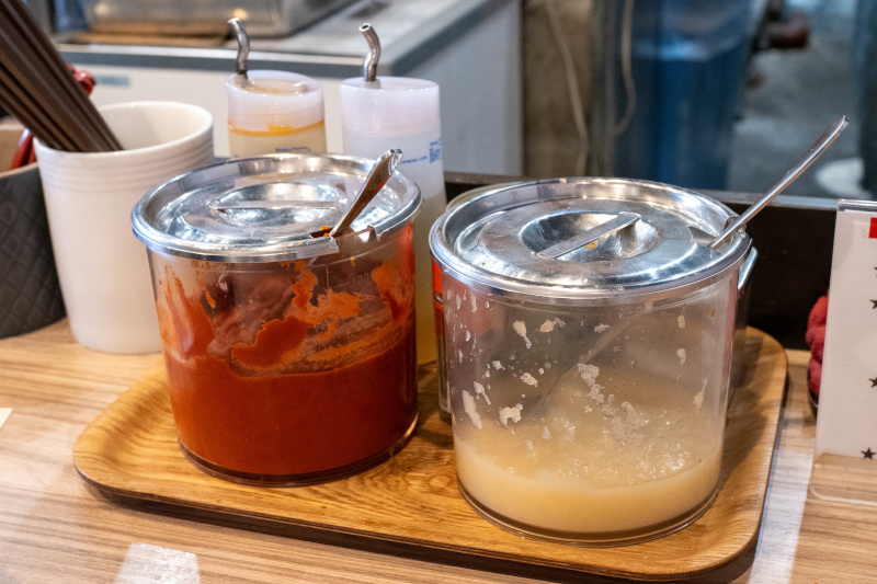 生卵 80、のり・とび辛・コーン 100、味玉 [2018/9/27] [2018/10/04] [2018/11/07] 130、ワンタン 160、メンマ 200、チャーシュー 300 ごはん 150、チャーシューユッケごはん 400 (限定ごはん) 魯肉飯 400 瓶ビール(赤星) 600、コエドビール 550、ウーロンハイ・バイスサワー 480 コーラ・オレンジジュース・ウーロン茶 200 [テイクアウト] 油そば 2食セット 1200 ワンタン 10個 800 おつまみ ラー油メンマ 540 (自家製ラー油と入りゴマで和えたメンマ) トッピングセット 600 (炙りチャーシュー、メンマ、味玉) チャーシューセット 600 (炙りチャーシュー、ゴロチャーシュー) 味玉5個セット 650 ---------- (以前のメニュー) [2019/10/18] 2019/10/17 料金改定 麺の量を選択する(無料) ラーメン:並 150g/大盛 200g/特盛 250g つけ麺・油そば:並 200g/大盛 300g 各メニュー +味玉 120、+チャーシュー 250、+特製 210 醤油 800 塩 800 生姜 850 煮干 [2018/9/27] 850 ブラック 850 油そば 750、貝出汁スープ付き 850 つけ麺(醤油/塩) 900 生卵 50、のり・唐華肉玉(油そば・ブラックにオススメ) 100、味玉 120、メンマ 150、チャーシュー 250 国産豚ジャンボ焼売 [2018/9/25] 300 肉みそ付きごはん 150、チャーシューユッケごはん 350 瓶ビール(サッポロラガー) 570、・ジョッキビール 550、ウーロンハイ・レモンサワー 400 コーラ・オレンジジュース 200、強炭酸 レモンパンチ 150 [2018/9/25] 醤油 750 塩 750 油そば 700、貝出汁スープ付き 800 生姜 850 煮干 800 ブラック 800 つけ麺(醤油) 850 各メニュー +味玉 100、+チャーシュー 250、+特製 230 味玉 100 肉みそ付きごはん 100、チャーシューユッケごはん 350 瓶ビール(サッポロラガー)・ジョッキビール 550、ウーロンハイ・レモンサワー 400 コーラ・オレンジジュース・強炭酸 レモンパンチ 200 |