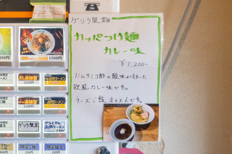 (限定) カッパつけ麺 カレー味 [2026/2/22] ¥1200 2026/2/22のゲリラ限定メニュー POPより バルサミコ酢の酸味が効いた欧風カレー味です。