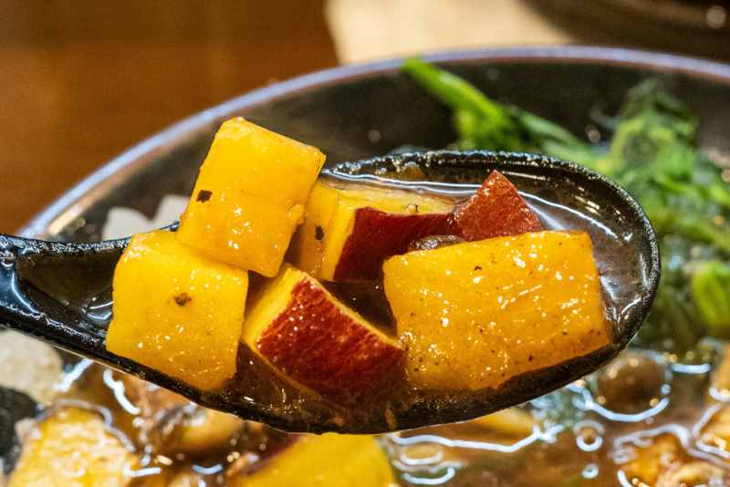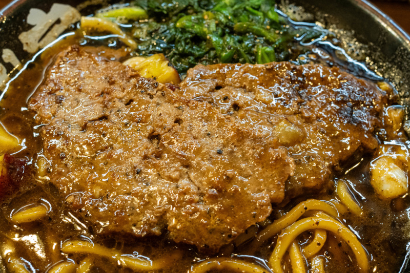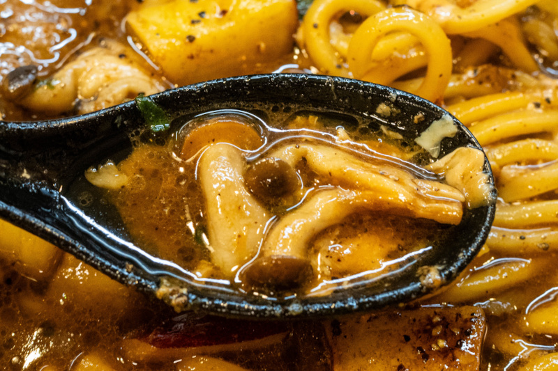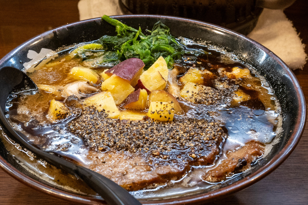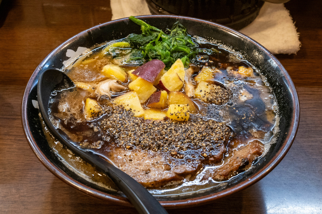 ベースはとき卵ラーメン。 ややとろみがあるしっかりと煮出された濃厚豚骨スープ。 そこに特製黒ダレ(焦がしネギ油とのこと)と、大量のブラックペッパーをプラスしてありスパイシー。 濃いめの味付けなこともあり、インパクト大。 麺は太麺で軽くウェーブがかかっている。 やや硬めのモッチリ感のある食感。 濃厚なスープに負けていない。 (山正食品) チャーシューはチャーバーグが2枚。柔らかく、肉の旨味があって美味しい。 サツマイモはサイコロ状で、甘味が箸休めになる。 しめじはソテーしてあり、秋らしい味わい。 ほうれん草は柔らかい。 ジャンキーなブラックラーメン! |