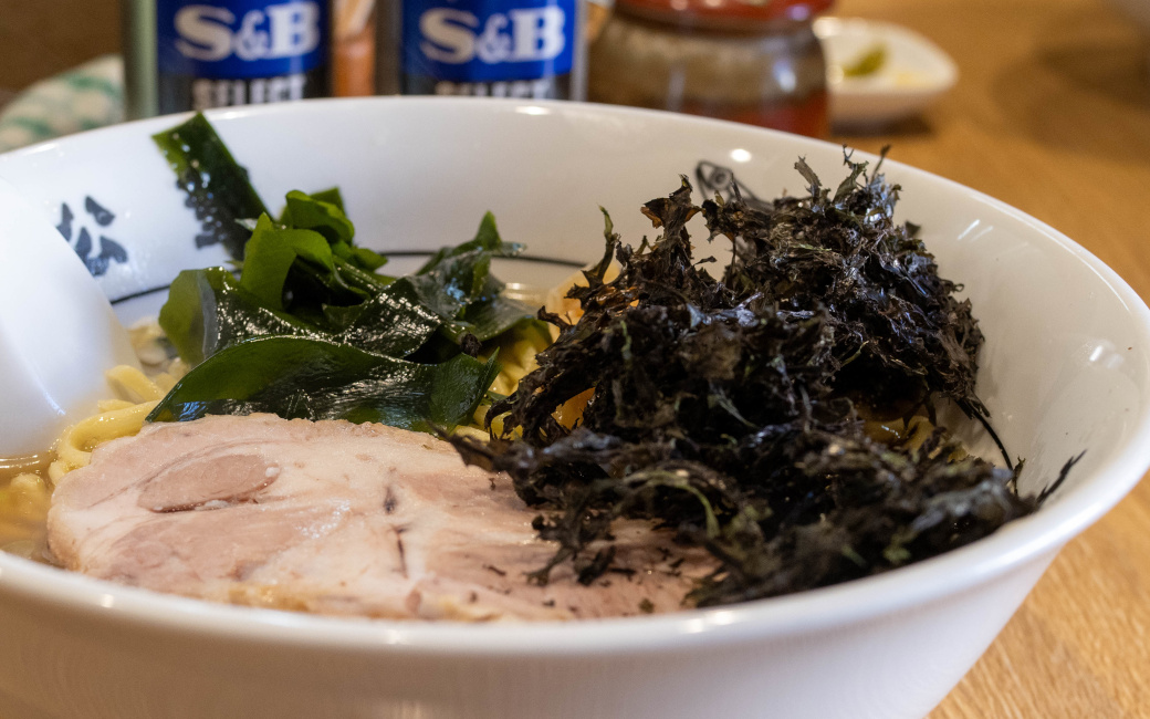山椒をかけると味が変わるよ♪ 具は、玉子半分、チャーシュー、メンマ、わかめ、のり ▶ とうがらしラーメン