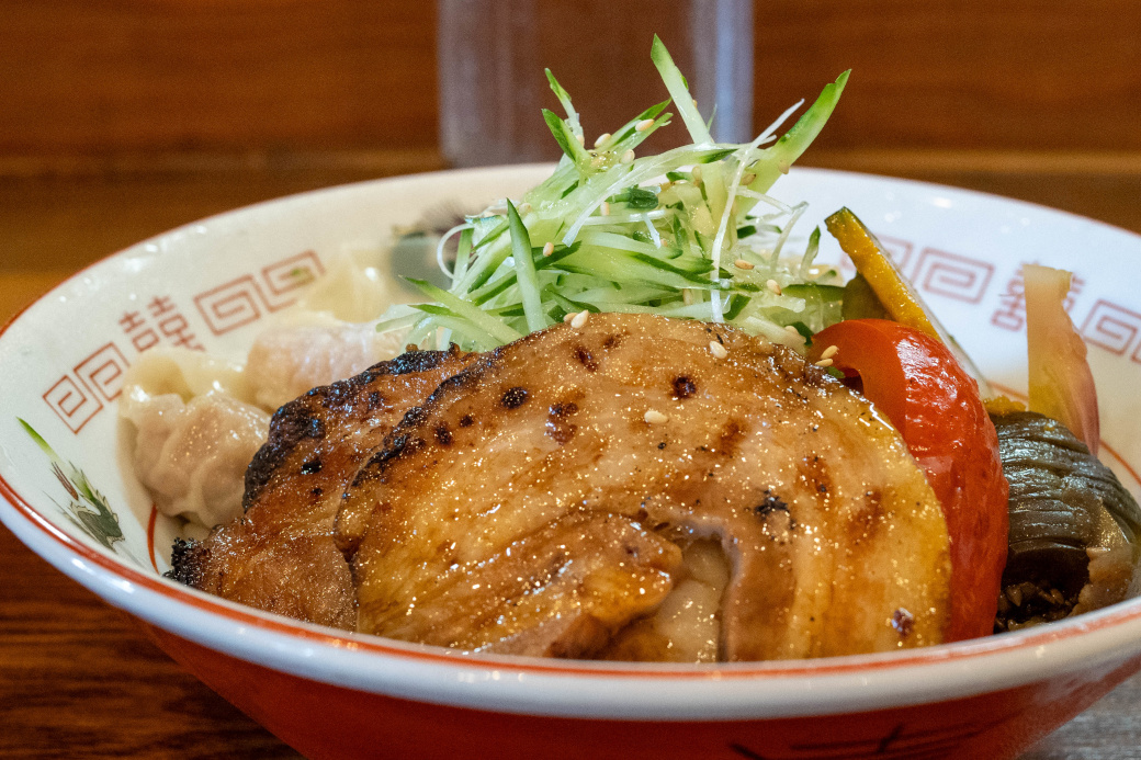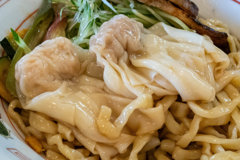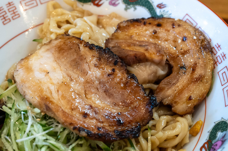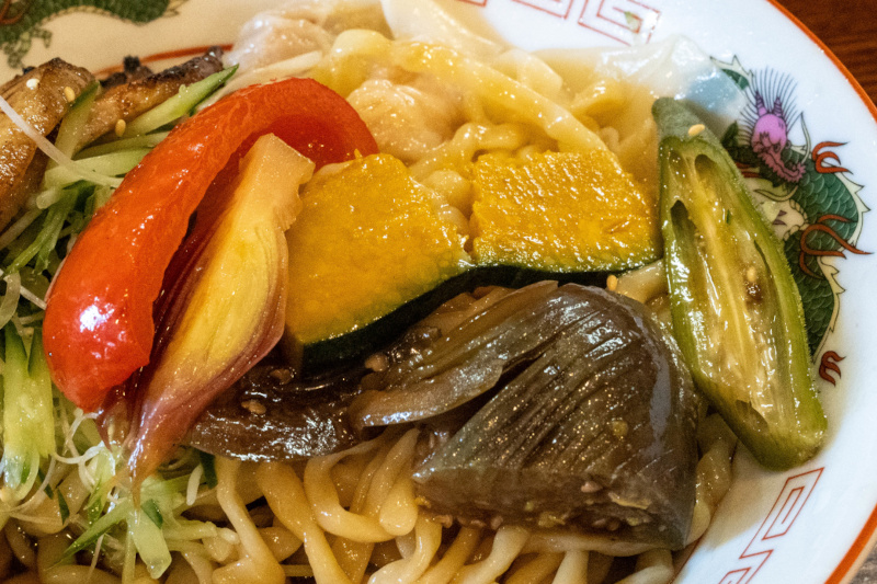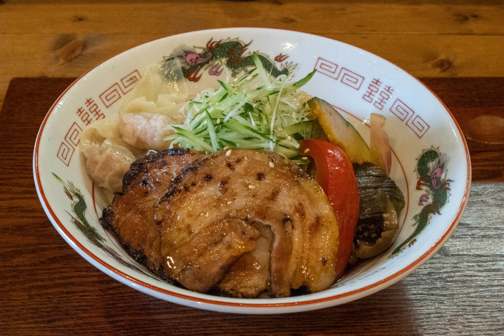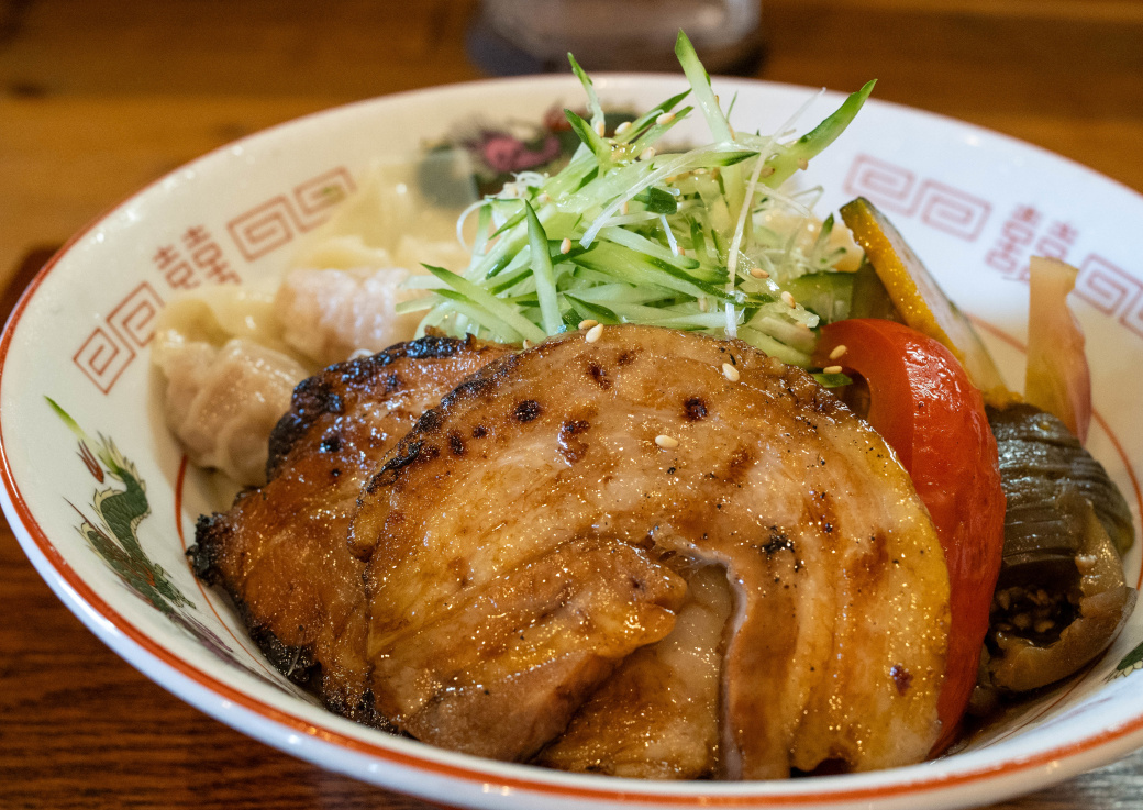 『お肉がメインの冷やし中華』とのこと。 麺は太い手揉み麺。 水で〆てあり、ツルッと滑らかで、プルッ・モチッとした弾力のあるモッチリとした食感。 小麦の香りが心地よいので、麺そのものが美味しい。 (自家製麺) 麺を丼の底にある内堀醸造の黒酢を使用したタレとよく混ぜて食べる。 まろやかな酸味と旨味のタレは多少のピリッと感があって美味しい。 チャーシューは諫美豚(かんびとん)の、分厚いカットのバラが2枚で、1枚はロールタイプ。 自家栽培したお米を与えて飼育しているためか、クセがなくスッキリとした旨味がある。 直前に炭火で炙ってあるので、香ばしさがプラスされてさらに美味しい。 冷やしワンタンは、海老ワンタン・肉ワンタンが1個ずつで、冷やしても美味しい。 夏野菜の焼き浸しは、パプリカ、南瓜、茄子、オクラ、茗荷。野菜の食感と旨味を残してある。 その他の具は、キュウリの千切り。 『お肉がメインの冷やし中華』というコンセプトが良くわかる 食べたこがない肉の美味しさ! |
