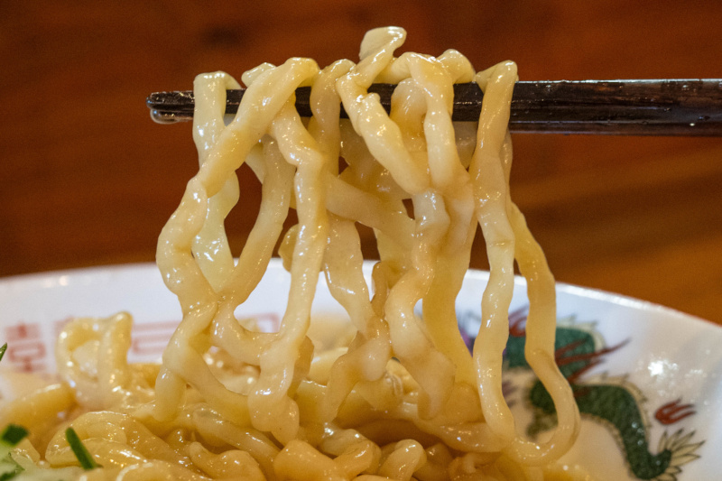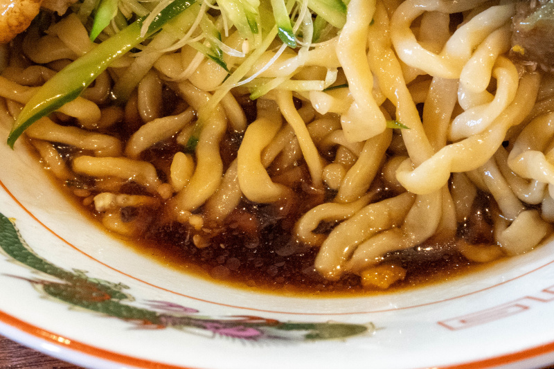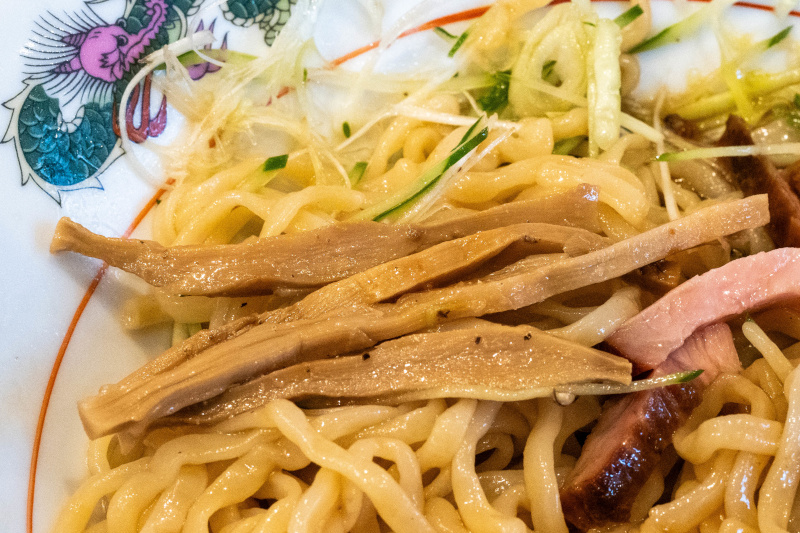 麺は中太の縮れ麺。 水で〆てあり、ツルッと滑らかで、弾力のあるモッチリとした食感。 小麦の香りが心地よく、麺そのものが美味しい。 (自家製麺) 麺を丼の底にある内堀醸造の黒酢を使用したタレとよく混ぜて食べる。 まろやかな酸味と旨味のタレは多少のピリッと感があって美味しい。 チャーシューは醤油と同じ、香り豚 シキンボウ(外モモ)のロースト・香り豚 肩ロース。 短冊切りにしてあるので、普段とはまた違った味わいが楽しめる。 メンマは細切りで、コリッとして風味が良い。 その他の具は、キュウリの千切り、茗荷、白ゴマ。 黒酢を使った冷やし中華 |