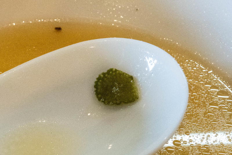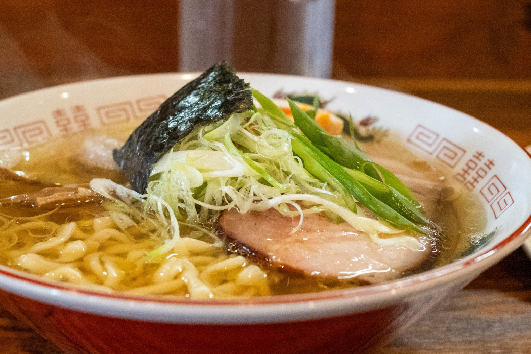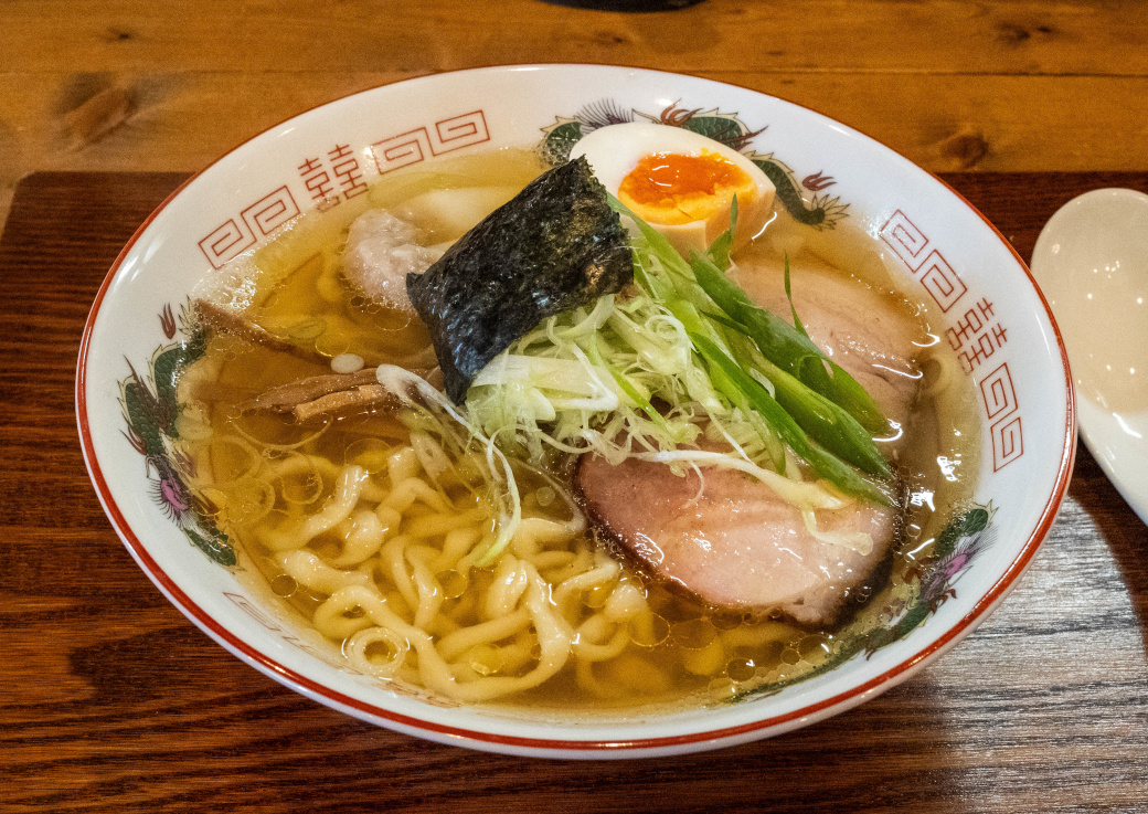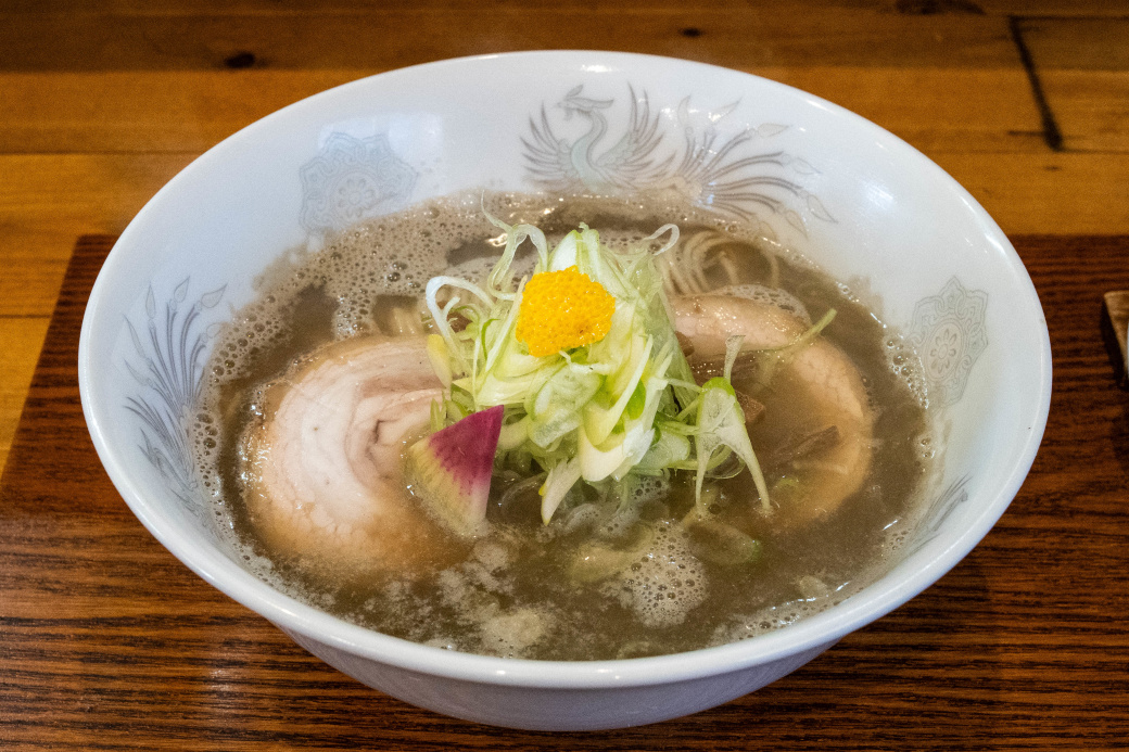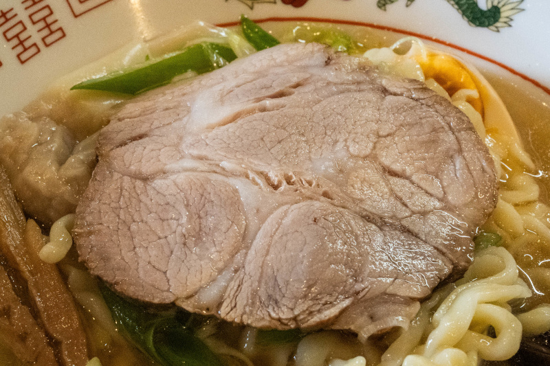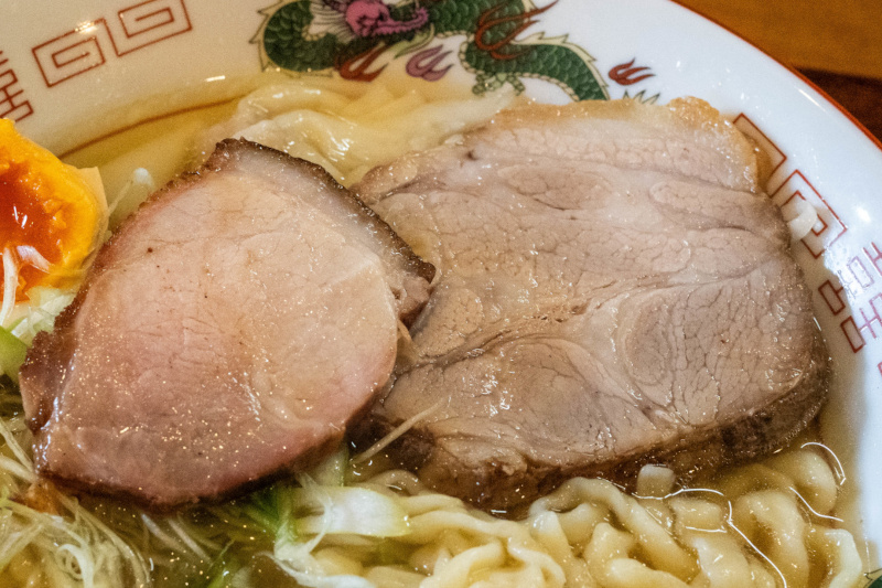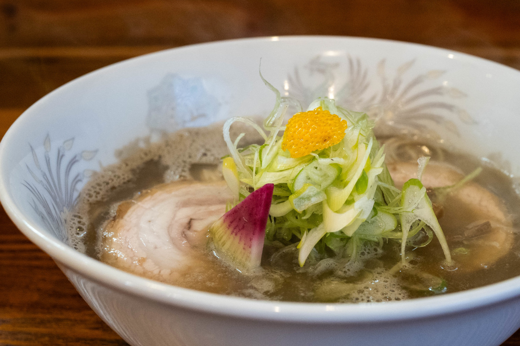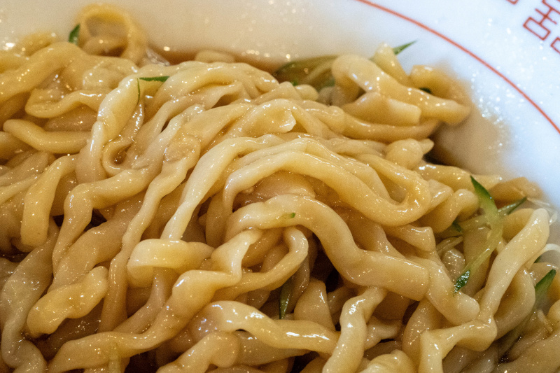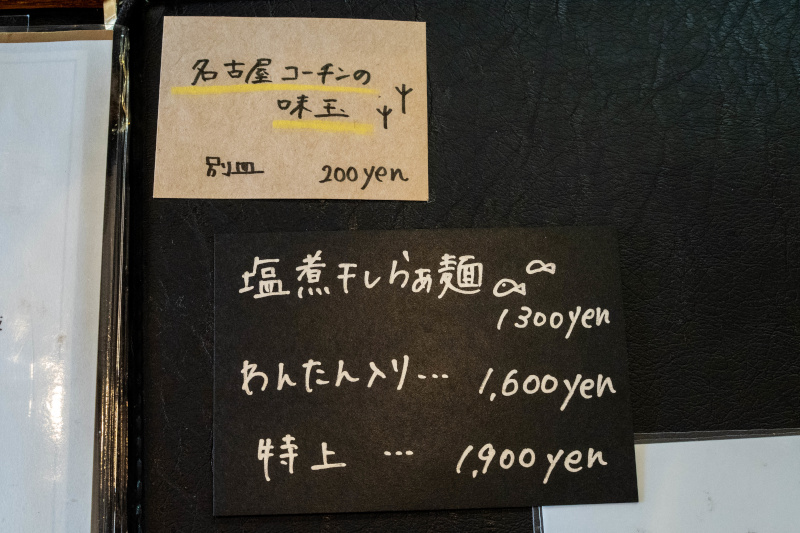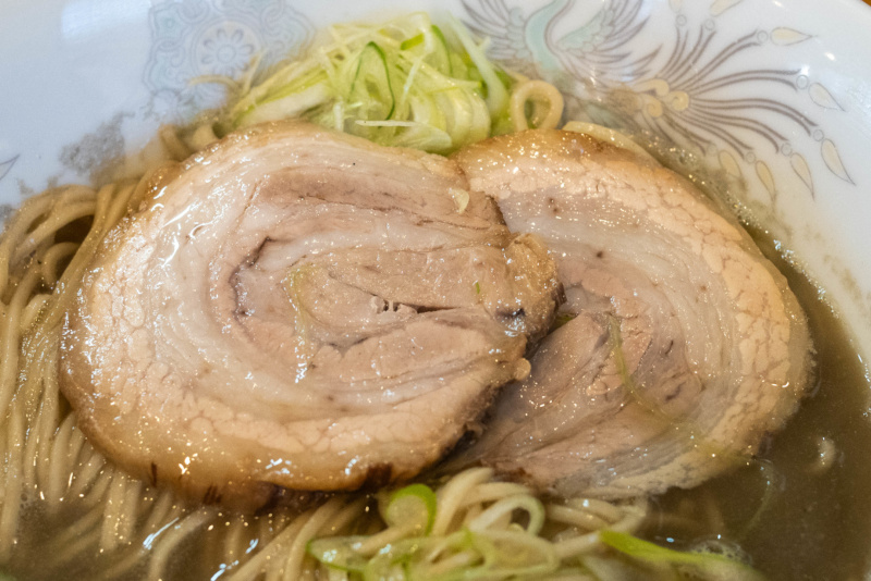 煮干しの柔らかい香りと甘味のスープは、じんわりと旨味が広がる。 雑味は皆無で、旨味だけを上品に抽出した印象。 まろやかな塩味で、ダシ感が良くわかるちょうど良い濃さ。 表面に油(鶏油?)が浮いているが、しつこさは感じない。 柚子皮が柑橘系の穏やかな味変になる。 麺は太い手もみ麺で、手もみならではの口当たりと、モチッとした食感。 小麦の香りと甘味があり、麺そのものが美味しい。 (自家製麺) チャーシューは2種。 シキンボは焼豚。厚みのあるカットで甘味のある味付けで、肉の旨味を堪能できる。 肩ロースは厚みのあるカットで、肉の旨味が満載。 味玉は名古屋コーチン。黄身がトロッとした半熟で、白身は全体的に薄らと色づいている。薄味で玉子の旨さを堪能できる。 ワンタンは海老で2個。海老の旨味とツルンとした皮が柔らかい。 メンマはコリッとして風味が良い。 その他の具は、風味の良い海苔。 薬味は、長ネギの白い部分のみじん切り、青い部分の笹切り。 煮干しの旨味を十分に引き出した一杯 |
