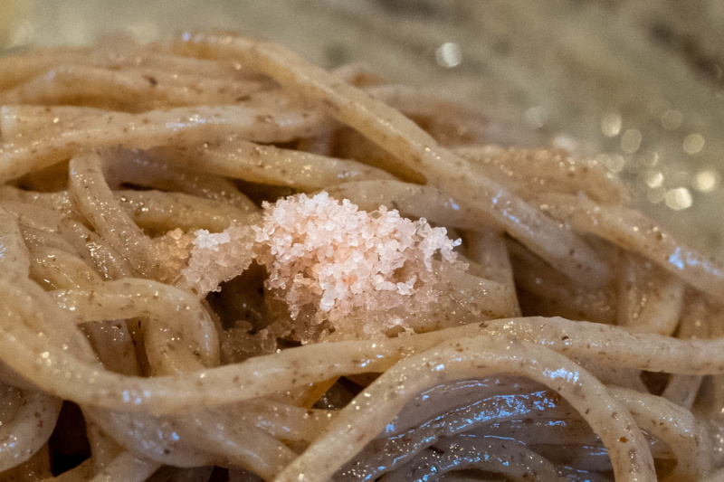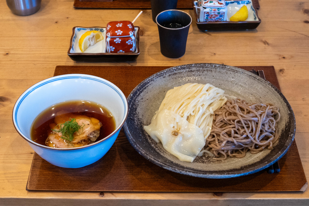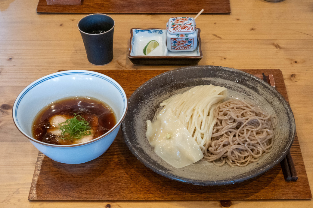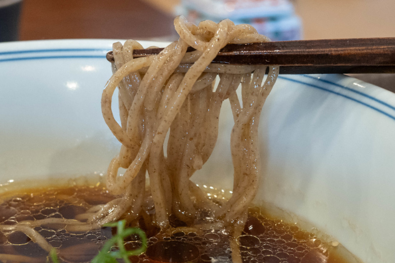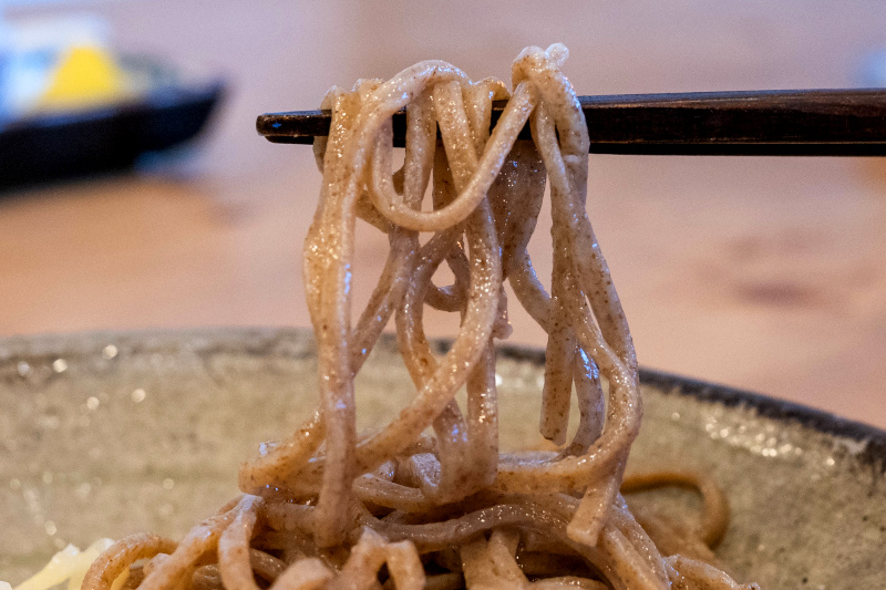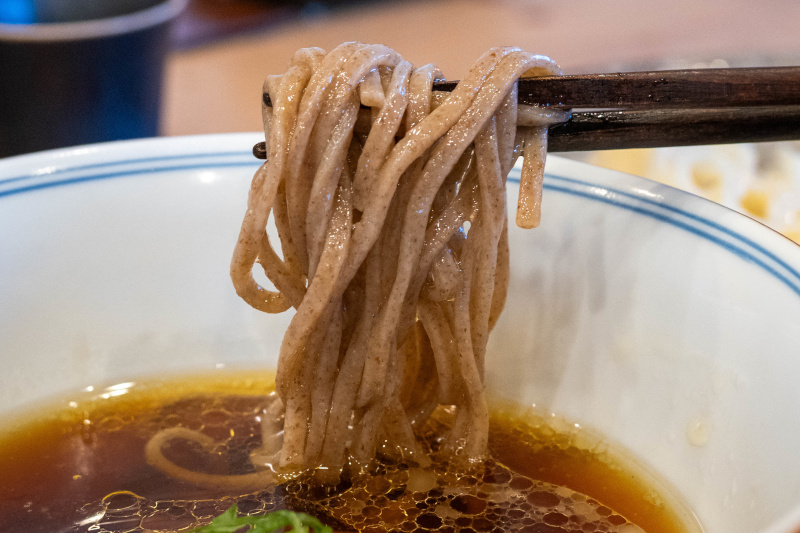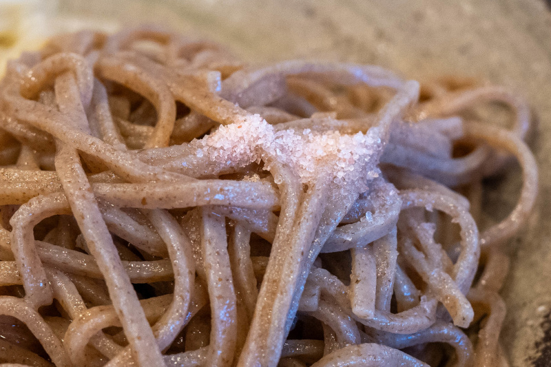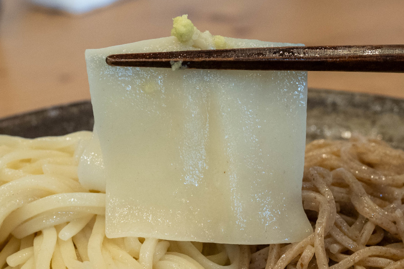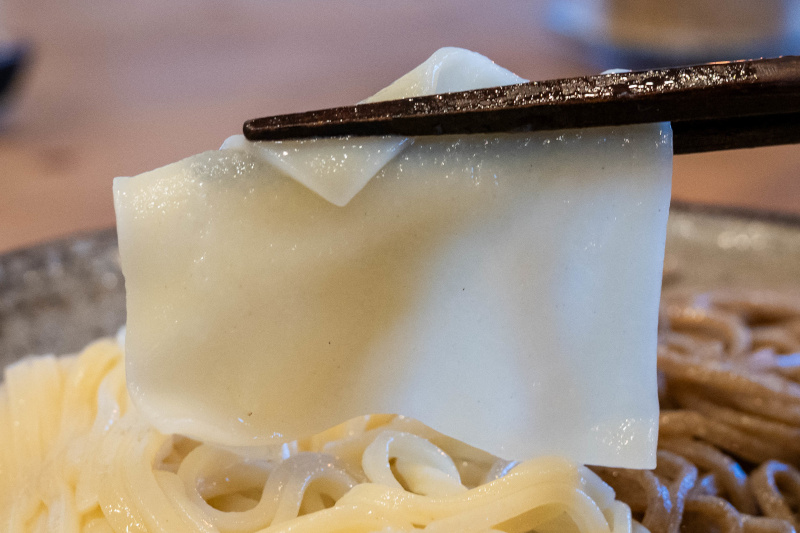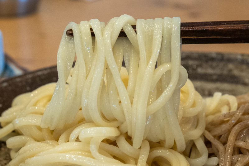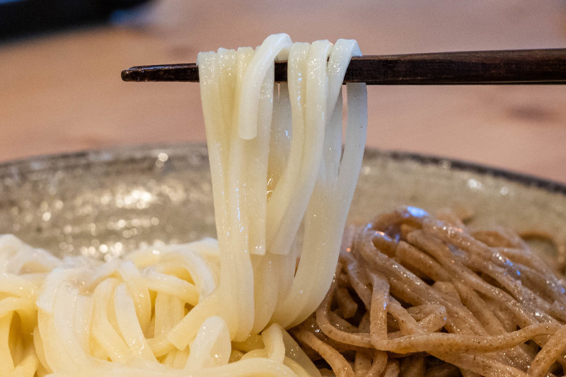 国産小麦ならではのきめ細かいシルキーな麺肌の白い麺(小麦粒の中心部)、石臼で独自に粒度調整した風味豊かな黒い麺(小麦粉の外側からその付近)。