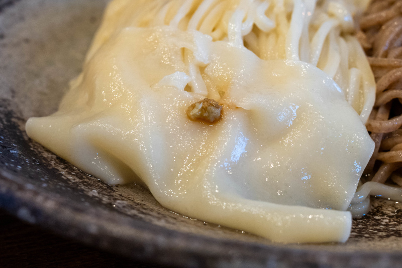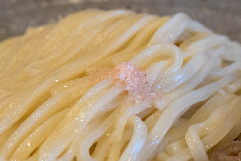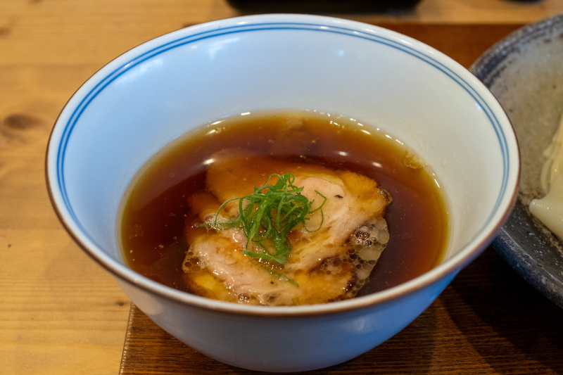途中から十勝ロイヤルマンガリッツァ背脂の溶け出しや揚げネギのアクセントで味のグラデーションをお楽しみください。 小麦つけ麺 FeeL the Wheat