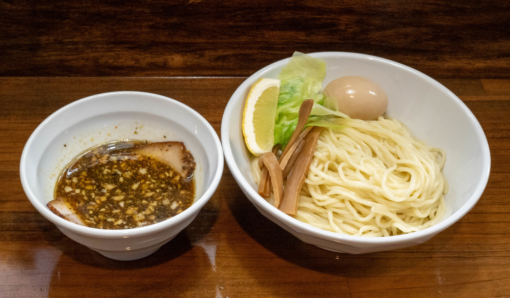 つけ汁には、チャーシュー、ナルト、メンマ |