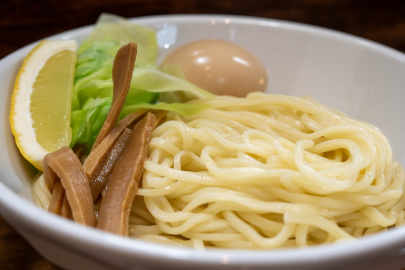 味玉、メンマ、キャベツ、レモンは麺の丼にトッピングされている |