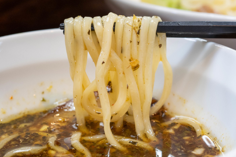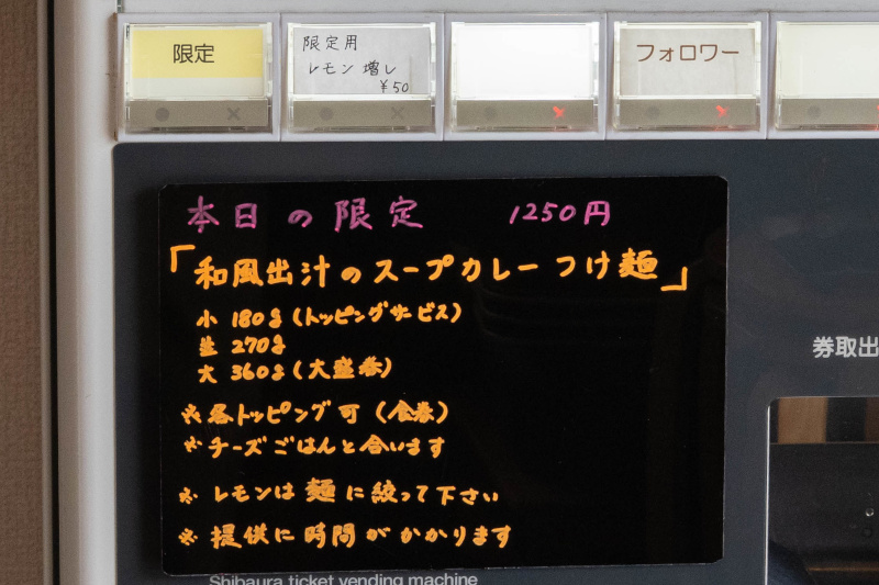 ※可能 替え玉、各種トッピング追加、各種トッピング無し、スープ割り ※テイクアウト可能 今週は久しぶりのスープカレーつけ麺です! 以前札幌で食べて気に入り、その後勤務先の早稲田の近くにあったスープカレー屋さんにもちょこちょこ行ってました。 そんなスープカレーをつけ麺にアレンジしてます。 昆布、煮干し、削り節の和風出汁をしっかりきかせたスープに優しくスパイス、ハーブを加えて仕上げてます。 いつも自分が作るものや一般的なカレーと比べるとスパイスや辛味は穏やかで、トロミや油っぽさはなく、さらさらあっさりです。 醤油ダレはたまり、キッコーゴ丸大豆なとをブレンドしてます。 食べ始めはそのままつけダレにつけて、途中レモンを麺に絞って味を変えて食べてください。 レモンが入って味が完成するようになってます! レモンはつけダレに絞ってしまうとほぼ存在感がなくなってしまうのでぜひ麺に絞ってくださいね! また、出汁が感じにくくなってしまうので辛味は弱いです。辛味を強くすることはできません。 さらに元々スープカレーライスをイメージして作ってる物なので、当然チーズご飯が必須です! 今回オプションで「レモン増し」もやってるので、増したレモンはチーズご飯にたっぷり絞ってレモンチーズご飯にしてお楽しみください! オススメです! ちなみにスープ割りはカレー感が薄まりすぎないように節の出汁に少量のカレー粉を溶かした物です。 スープ割りすると塩分が下がってより出汁感が楽しめると思います! |