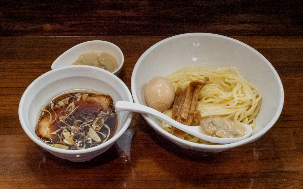 (限定) アサリ醤油つけ麺・小 + 味玉 + アサリペースト増し [2025/4/27] ¥1150+サービス+¥200 2025/4/27からの40食限定 【お店からの告知(要約)】 ※可能 替え玉、各種トッピング追加、各種トッピング無し(アサリペースト無しは不可)、スープ割り