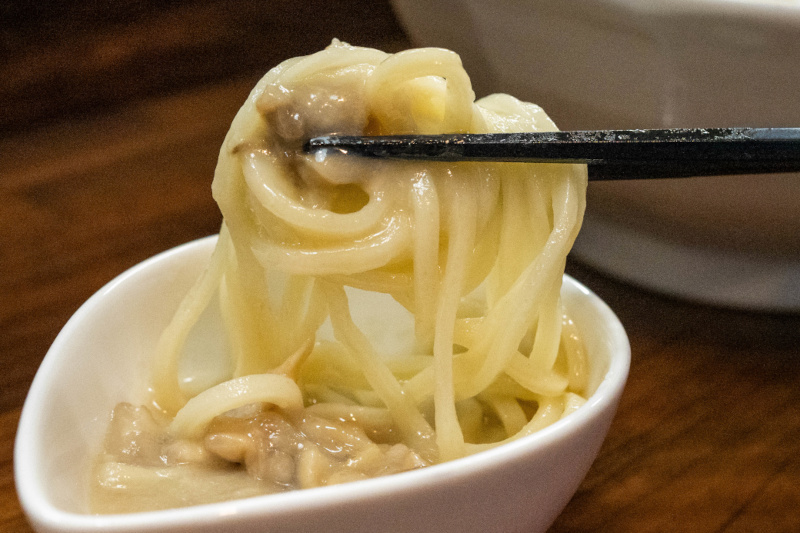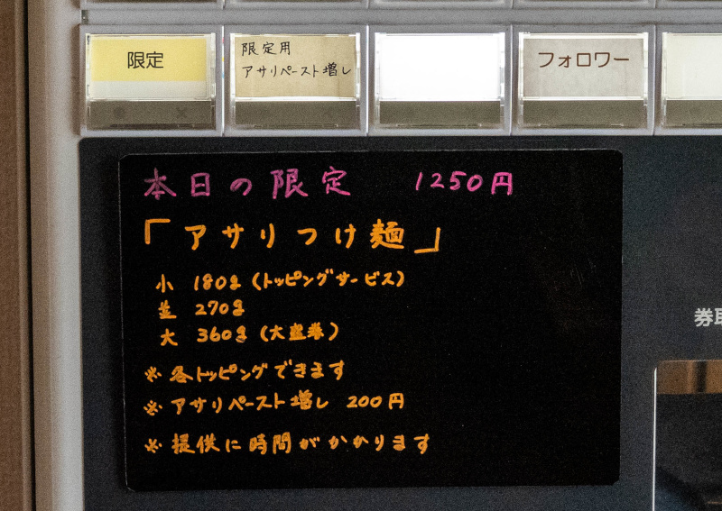 ※可能 替え玉、各種トッピング追加、各種トッピング無し(アサリペースト無しは不可)、スープ割り ※テイクアウト可能 ひやもりつけ麺の限定としては今シーズン最後となります! 4月に作ったときはスープにもしっかりアサリのお出汁をきかせてましたが、今回のスープは煮干し昆布豚のシンプルな物に、アサリペーストとアサリ脂で仕上げてます。 醤油ダレもたまり醤油をきかせたキリッとしたタイプ。 食べ始めは醤油とアサリの香りを楽しみながら、後半でレンゲのアサリペーストを溶かし込むとガツンとアサリが強まります! このつけ麺はブラックペッパーと相性がとてもいいので、ぜひ途中で麺の方にブラックペッパーをふって食べてみてくださいね! アサリなのでチーズご飯ともとてもあいます! 今回も数量限定で別皿アサリペースト増しもあります。 さらに数量限定でフォロワー限定もあります。 以下フォロワー限定のご案内です。 ※フォロワー限定は店頭で告知説明していません。どれを買えばいいのか?など聞かれても説明していません。本文でご確認ください。 フォロワー限定 「おかわりアサリ油そば」 ※テイクアウト不可 ※アサリつけ麺をご注文のお客様専用です。 ※おかわりアサリ油そばは作るのに2分ほどかかります。最初に食券を渡してもらい、作り始めていいタイミングで声をかけてください。後からの追加の場合少し提供時間が長くなる場合があります。 以前アサリまぜそばの時にもお出しした細麺アサリ油そばです! 卵入の中細麺に醤油ダレ、アサリ脂、アサリペースト、刻みネギ、刻みチャーシューをトッピングしてあります。 そのままよく混ぜて油そばとして、途中ブラックペッパーで味変しながらお楽しみください! もちろんつけダレにつけて食べることもできますが、つけてしまうと普通の替え玉とあまり変わりなくなってしまうのでご注意ください。 フォロワー限定のご注文方法は券売機1番下の段にある「フォロワー」ボタンで350円でお願いします。 |