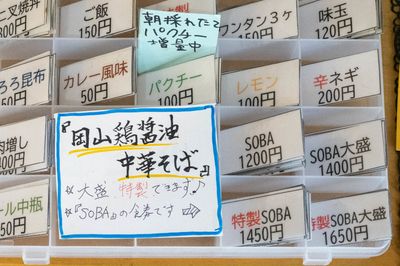 ★限定『手打ち極太中華SOBA』やりますッ! 小麦は「もち姫」8割「はるゆたか」2割の超多加水 「SOBA」の食券をお取り下さい。 ・大盛と冷製不可、替玉有り(細麺) ・特製OK ・醤油、塩選べます |