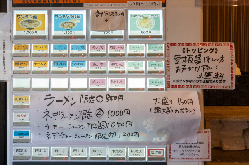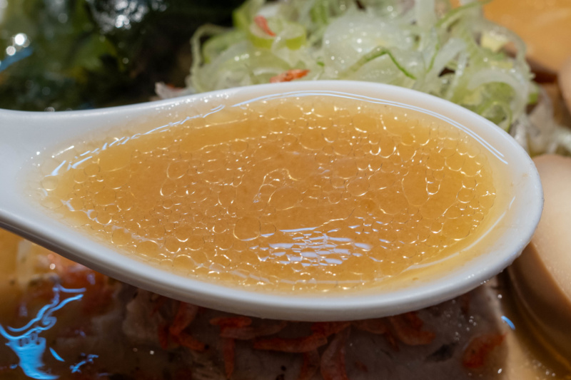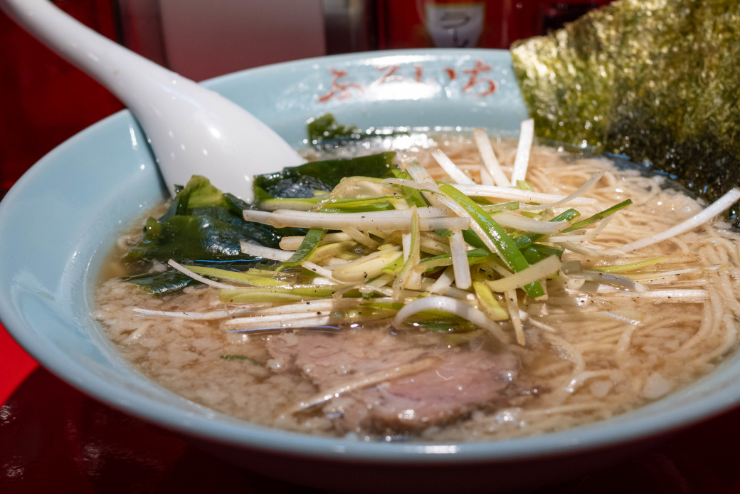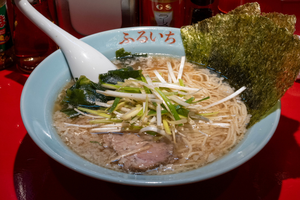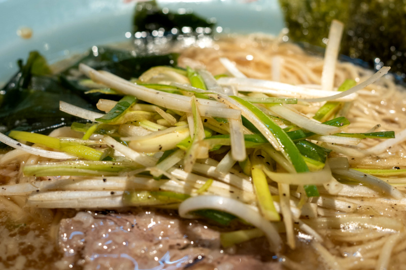 (限定) [マルフル的ラーショ] ネギラーメン [2026/1/3] ¥1000 2026/1/3の限定メニュー 臭みのないライトな背脂豚骨スープで、表面の油・背脂は多くなく、しつこくなくまろやかさがある。 背脂の甘味と香ばしさが特徴的。 味付けは醤油ベースで、ちょうど良い濃さ。 化学調味料は気にならない。 専用の調味料、豆板醤・おろしニンニクで味変して、異なる味わいが楽しめるも良い。 麺は中細ストレート。 適度な硬さの茹で上げで、ツルツルとしてスープとの相性は良い。 (製麺所は不明) チャーシューは肩ロースで、柔らかく美味しい。 ネギは白髪ネギ状で、ゴマ油の風味がアクセントになり、シャキシャキとして、柔らかめのネギの歯ごたえが旨い。 ネギに細切りチャーシューは和えておらず、ネギのみ。 その他の具は、ワカメ、海苔3枚。 薬味のネギなどはなし。 丼は広口で背が低めの反り丼。 クセのないラーショ! |
