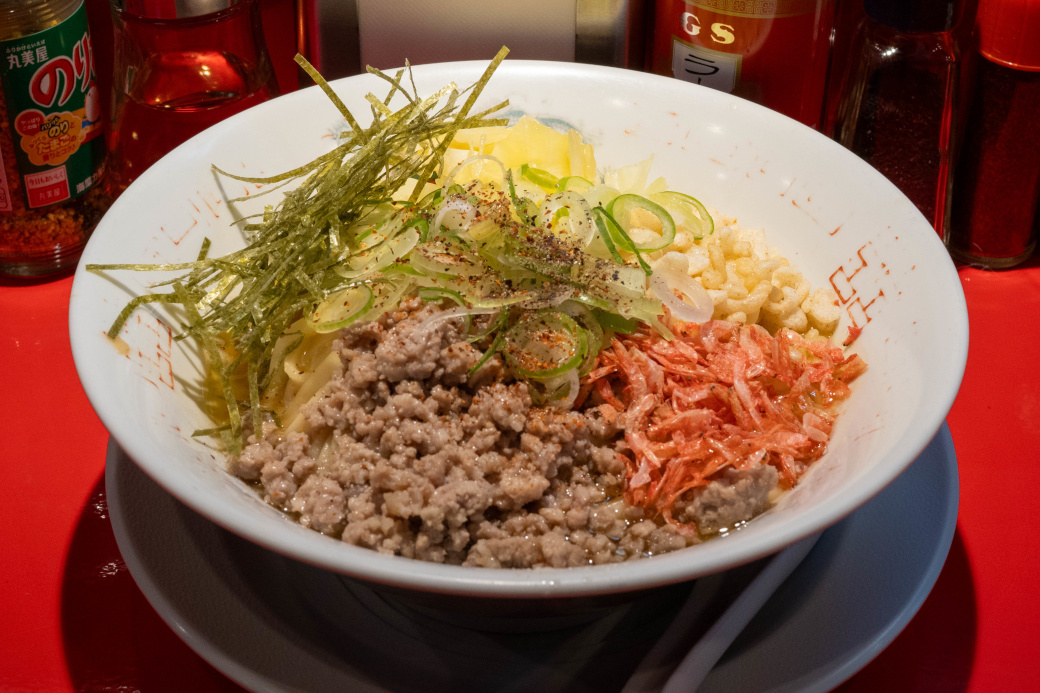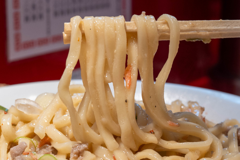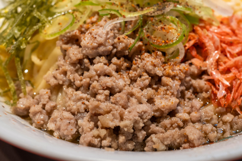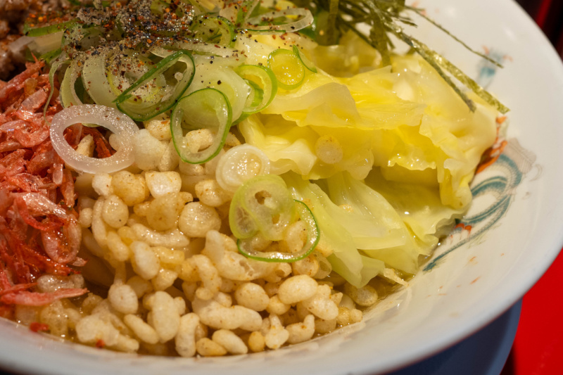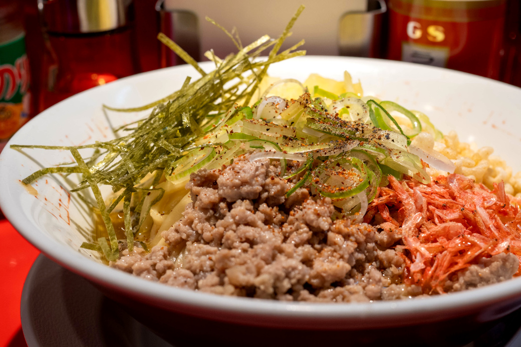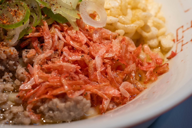 (限定) 濃厚海老味噌まぜそば [2026/1/17] ¥1100 2026/1/16~1/21の限定メニュー 良くかき混ぜて、丼の底に溜まったタレに麺に絡めて食べる。 味噌ベースのタレは多めで、海老の風味がたっぷりで濃厚。 麺は茹でたての平打ち麺。 適度な硬さの茹で加減で、モチモチの食感があり、麺そのものが美味しい。 まぜそばらしい存在感がある。 (自家製麺) 卓上の、一味唐辛子、胡椒、酢での味変が良く合う。 チャーシューのかわりの豚挽肉は、ちょうど良い濃さの味付け。 干し海老が香ばしい。 キャベツはシャキシャキ。 その他の具は、揚げ玉。 薬味は、長ネギの小口切り、刻み海苔。 海老風味の味噌まぜそばは初だが美味しい! |