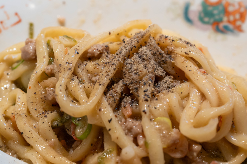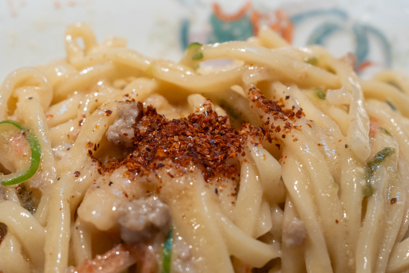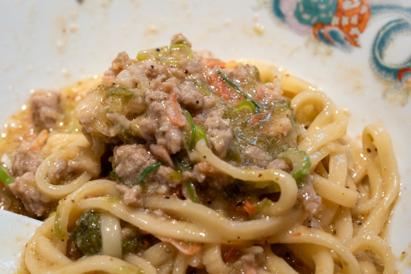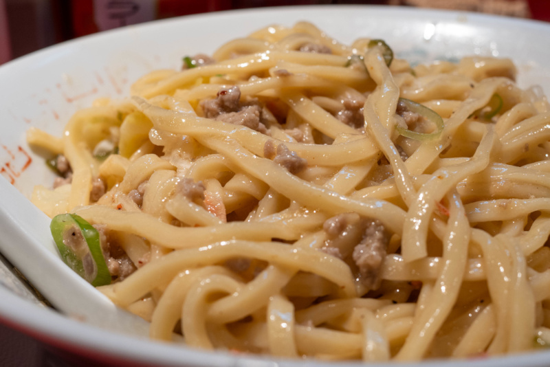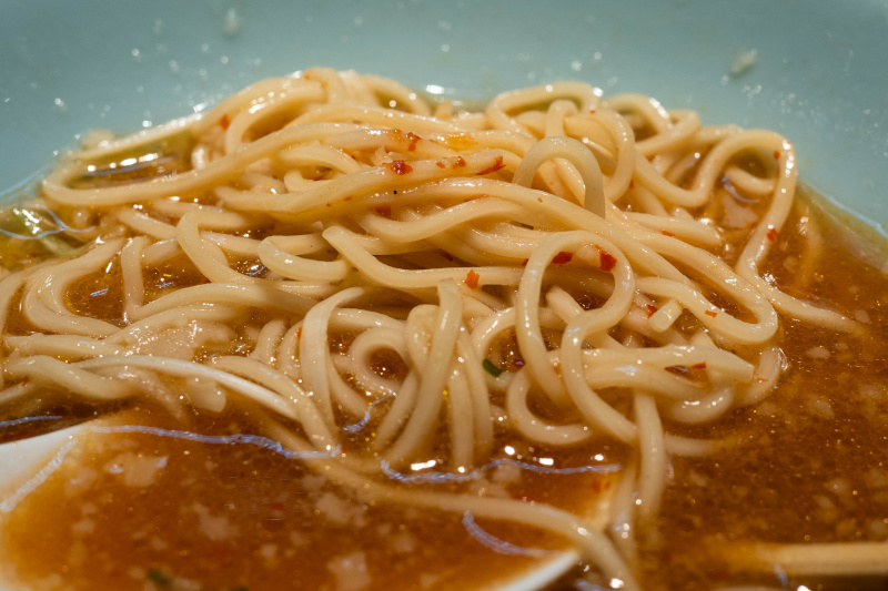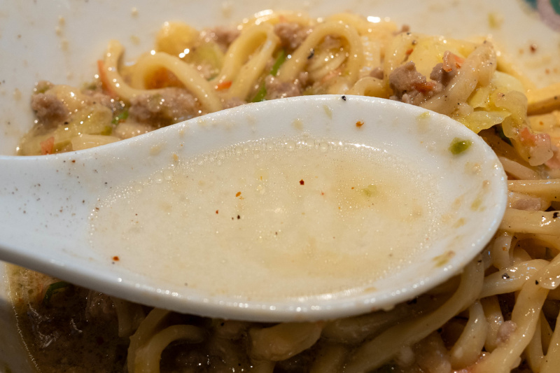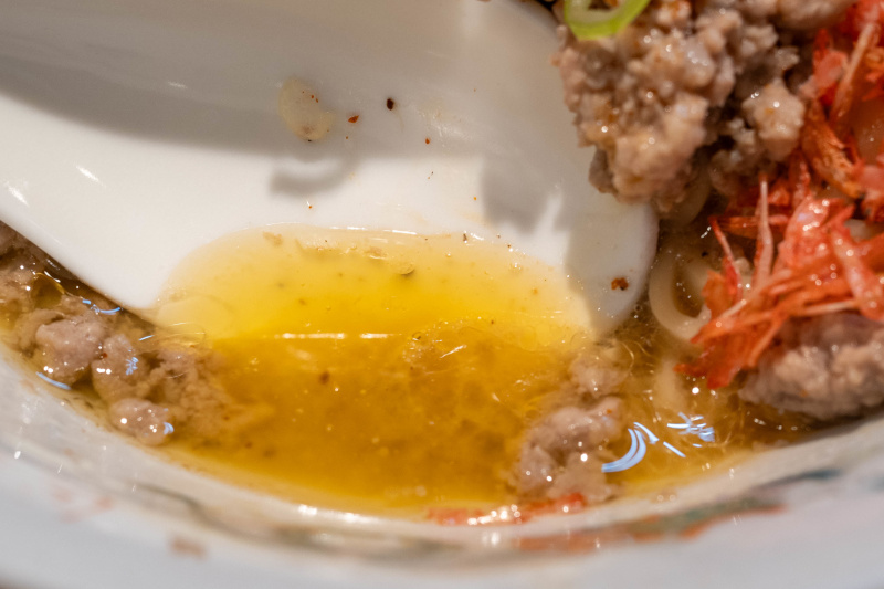 (限定) 濃厚海老味噌まぜそば [2026/1/17] ¥1100 2026/1/16~1/21の限定メニュー 良くかき混ぜて、丼の底に溜まったタレに麺に絡めて食べる。 味噌ベースのタレは多めで、海老の風味がたっぷりで濃厚。 麺は茹でたての平打ち麺。 適度な硬さの茹で加減で、モチモチの食感があり、麺そのものが美味しい。 まぜそばらしい存在感がある。 (自家製麺) 卓上の、一味唐辛子、胡椒、酢での味変が良く合う。 チャーシューのかわりの豚挽肉は、ちょうど良い濃さの味付け。 干し海老が香ばしい。 キャベツはシャキシャキ。 その他の具は、揚げ玉。 薬味は、長ネギの小口切り、刻み海苔。 海老風味の味噌まぜそばは初だが美味しい! |