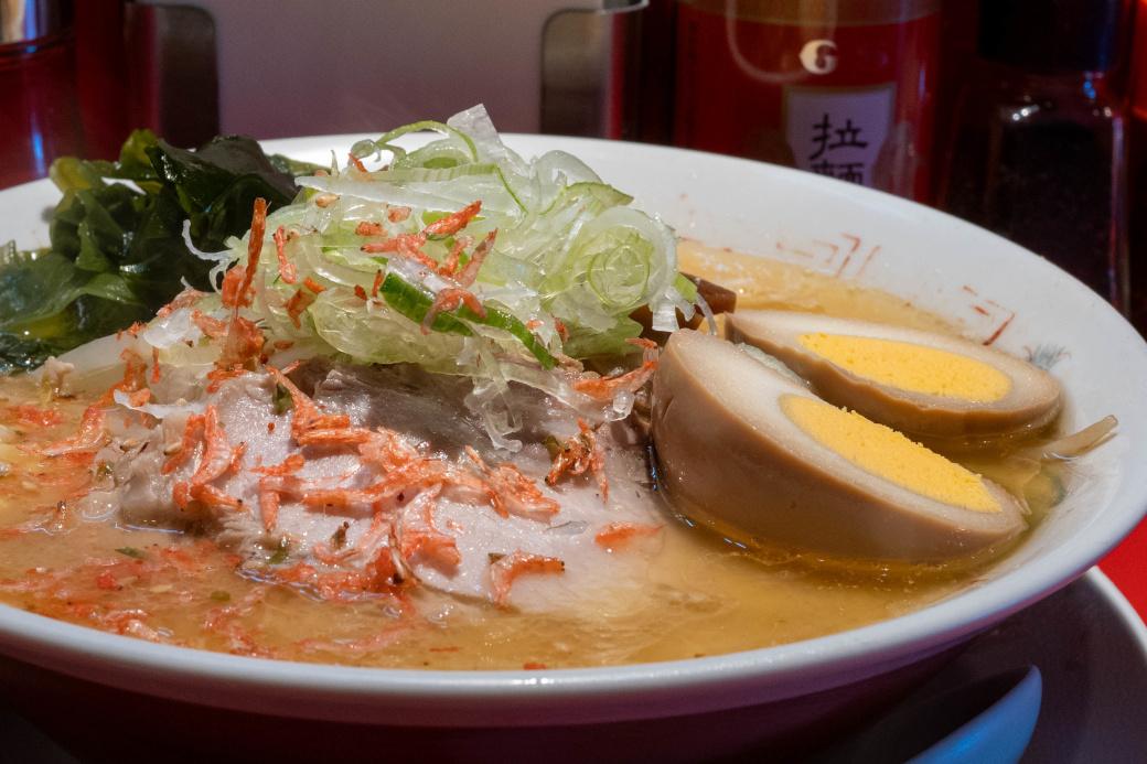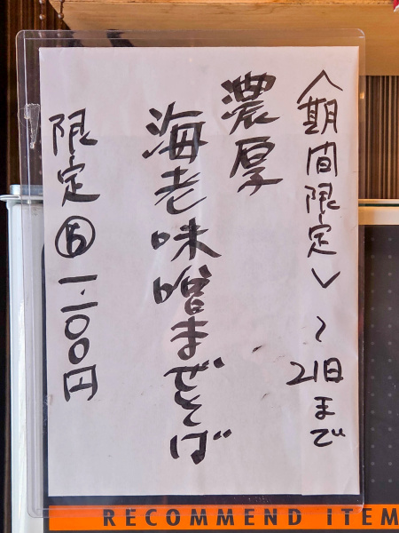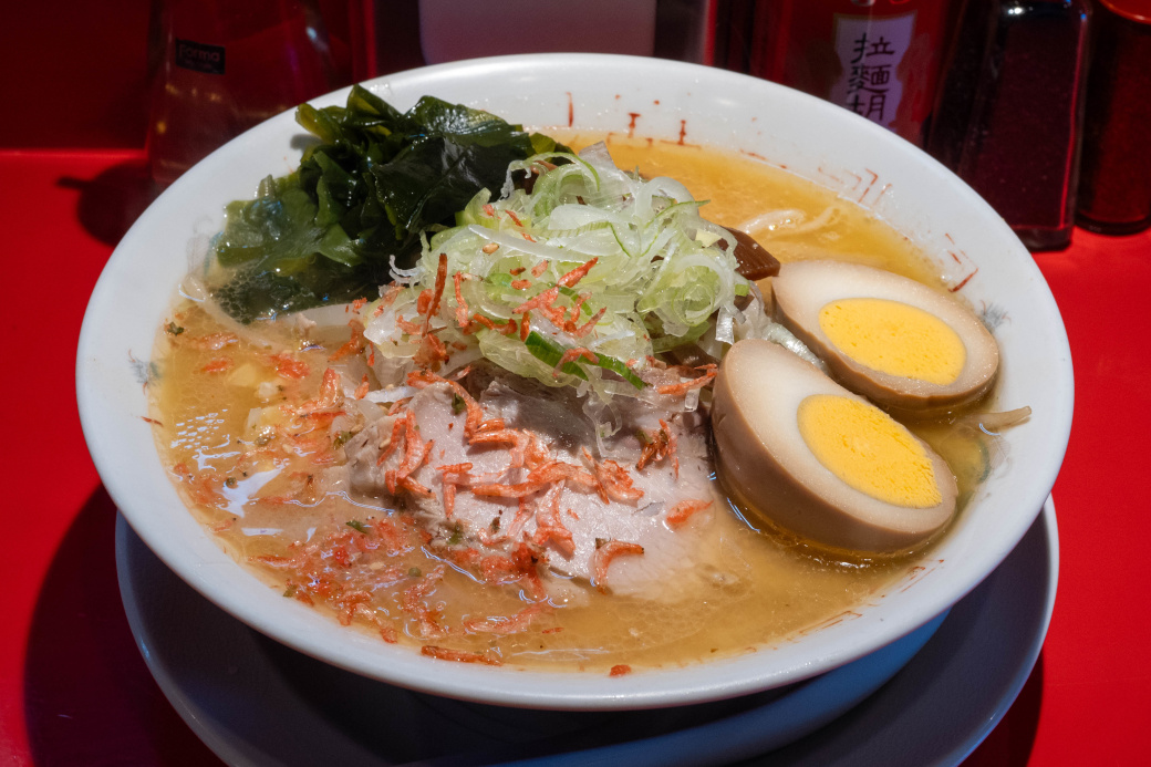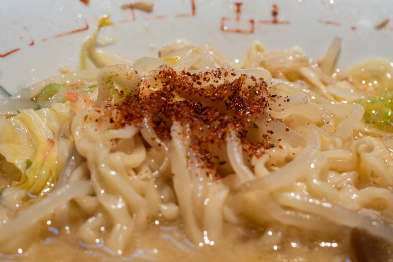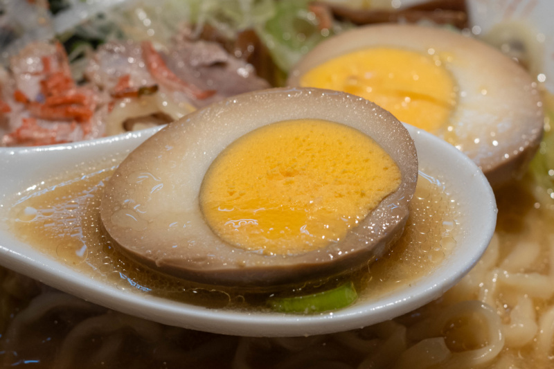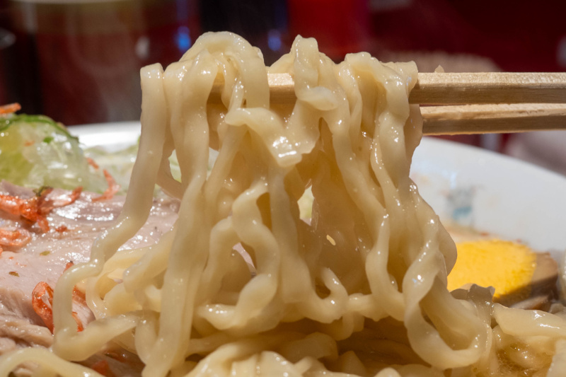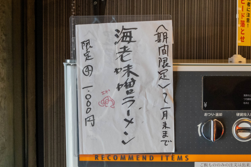 (限定) 海老味噌ラーメン + 煮玉子 [2026/1/31] ¥1000+¥100 2026/1/21からの限定メニュー 熱々のスープはとろみがあって、後半まで温度が下がりにくい。 芳醇な味噌の香りと旨味があり、ほんのりと海老が香る味噌味。 表面には透明な脂が浮いているが、しつこさはない。 卓上の一味唐辛子でピリッと引き締まる。 麺は平打ち麺に直前に手もみを加えたもの。 適度な硬さの茹で上げで、表面がツルツルで、モチッとした弾力のある食感。 小麦の香りと甘みがあり、麺そのものが美味しい。 (自家製麺) チャーシューは肩ロースが2枚で、薄味の味付けで肉の旨味があり美味しい。 煮卵は半分にカットしてある。 黄身は固茹でで、白身は表面に近い部分が濃いめに色づいている。半熟味玉とは全く異なる美味しさ。 モヤシ、キャベツのシャキッと感と、挽肉の旨味が加わる。 干し海老が香ばしい。 公式Xの画像によると、メンマ入れ忘れ? その他の具は、ワカメ。 薬味は、長ネギの白い部分の小口切り、干し海老。 身体が温まる冬らしいラーメン |