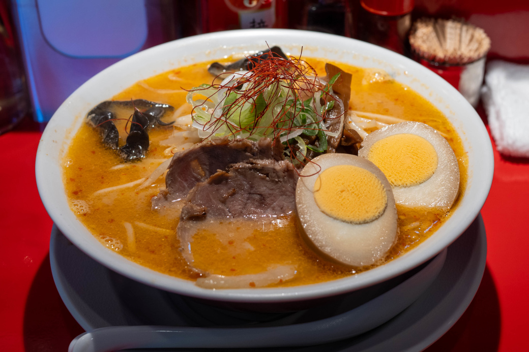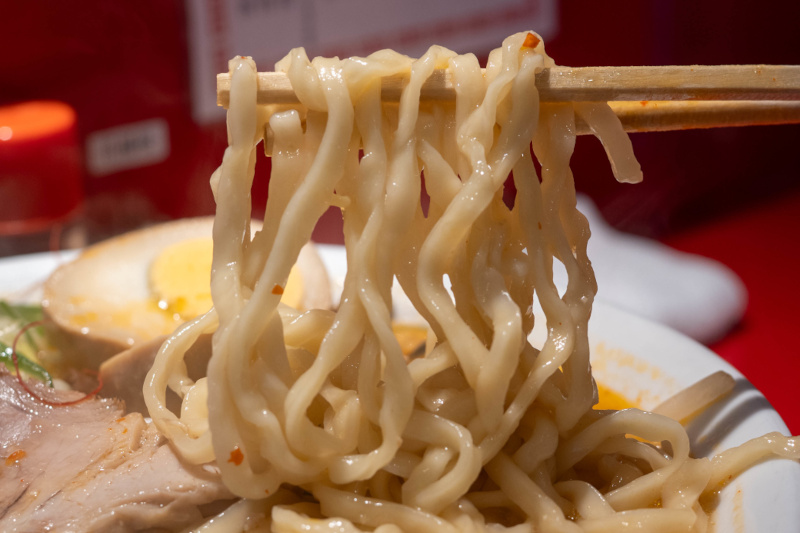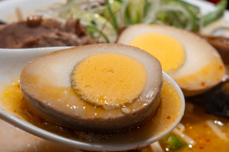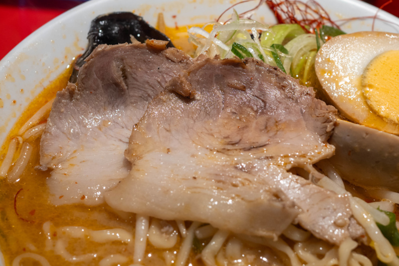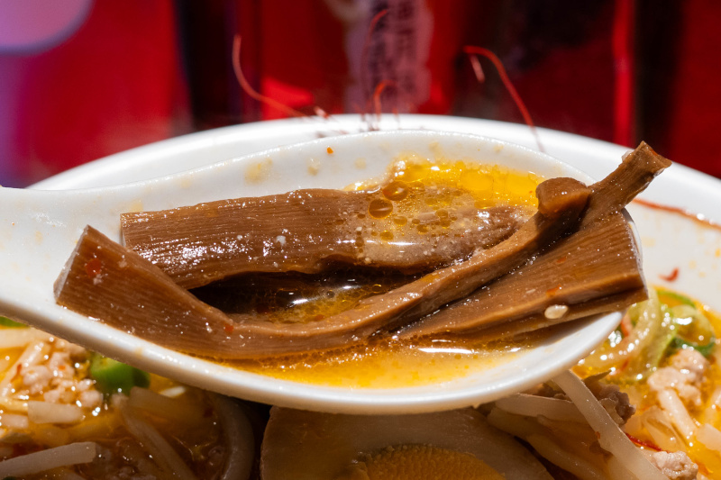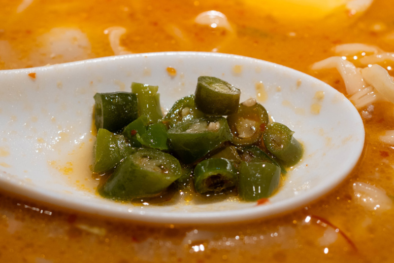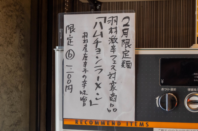 (限定) ハムチョンラーメン + 煮玉子 [2026/2/1] ¥1100+¥100 2026/2/1から提供の 「羽村激辛フェス2026」エントリー限定メニュー 熱々のスープはとろみがあって、後半まで温度が下がりにくい。 芳醇な味噌の香りがよいスープは、赤い唐辛子と、羽村産 生の青唐辛子の輪切りで辛いが、辛すぎない旨辛。 表面には透明な脂が浮いているが、しつこさはない。 麺は平打ち麺に直前に手もみを加えたもの。 適度な硬さの茹で上げで、表面がツルツルで、モチッとした弾力のある食感。 小麦の香りと甘みがあり、麺そのものが美味しい。 (自家製麺) チャーシューは肩ロースが2枚で、薄味の味付けで肉の旨味があり美味しい。 煮卵は半分にカットしてある。 黄身は固茹でで、白身は表面に近い部分が濃いめに色づいている。半熟味玉とは全く異なる美味しさ。 モヤシのシャキッと感と、挽肉の旨味が加わる。 メンマは平たくコリッとした食感。 キクラゲはカットしてないコリコリ。 薬味は、長ネギの白い部分の小口切り、糸唐辛子、青唐辛子の輪切り。 身体が温まる旨辛味噌ラーメン |
