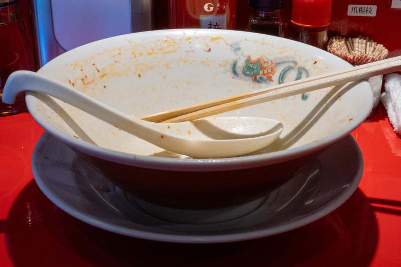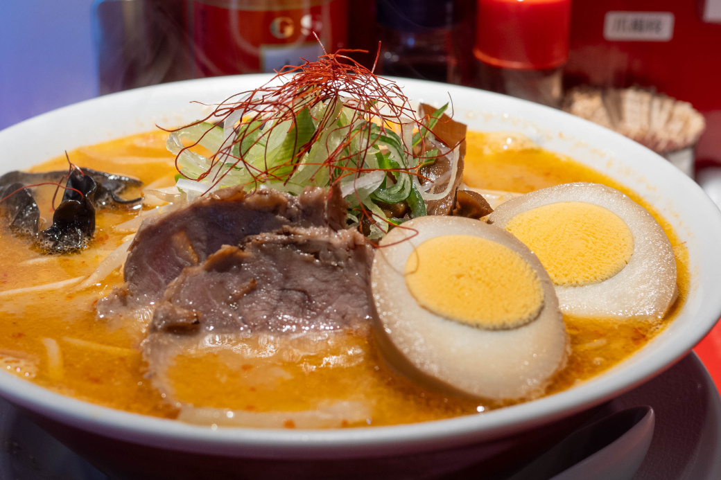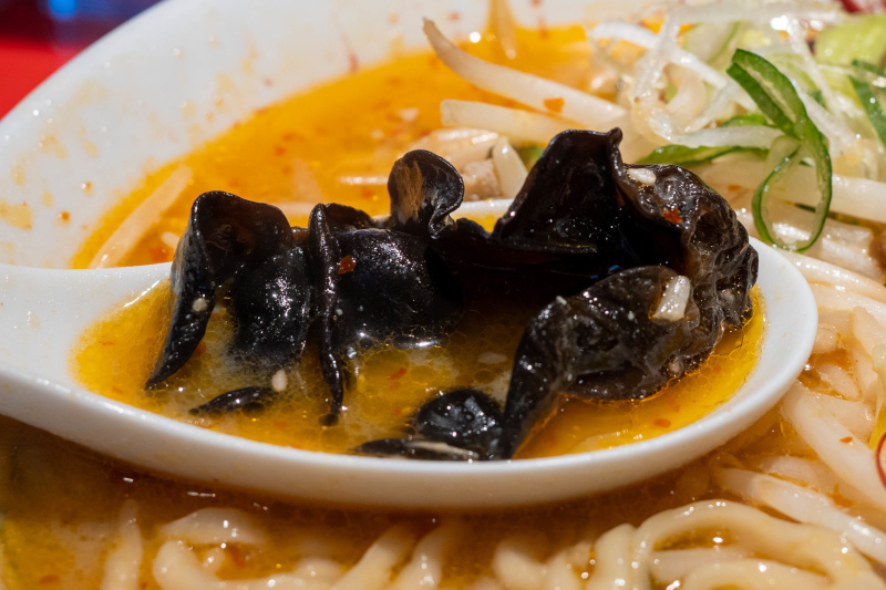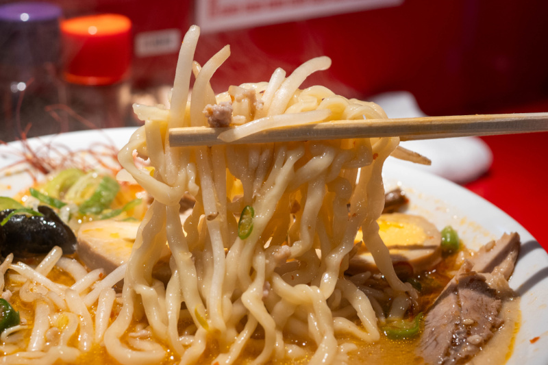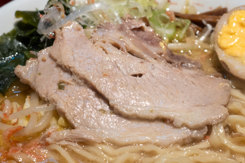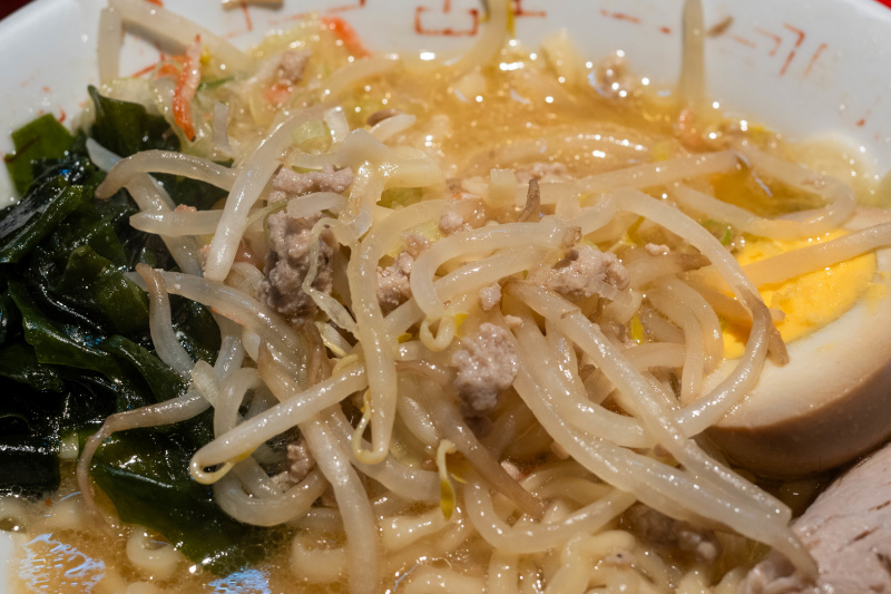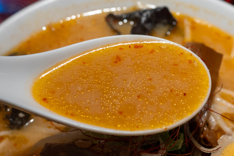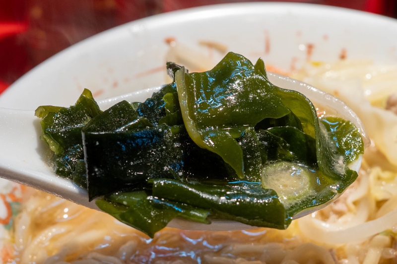 (限定) ハムチョンラーメン + 煮玉子 [2026/2/1] ¥1100+¥100 2026/2/1から提供の 「羽村激辛フェス2026」エントリー限定メニュー 熱々のスープはとろみがあって、後半まで温度が下がりにくい。 芳醇な味噌の香りがよいスープは、赤い唐辛子と、羽村産 生の青唐辛子の輪切りで辛いが、辛すぎない旨辛。 表面には透明な脂が浮いているが、しつこさはない。 麺は平打ち麺に直前に手もみを加えたもの。 適度な硬さの茹で上げで、表面がツルツルで、モチッとした弾力のある食感。 小麦の香りと甘みがあり、麺そのものが美味しい。 (自家製麺) チャーシューは肩ロースが2枚で、薄味の味付けで肉の旨味があり美味しい。 煮卵は半分にカットしてある。 黄身は固茹でで、白身は表面に近い部分が濃いめに色づいている。半熟味玉とは全く異なる美味しさ。 モヤシのシャキッと感と、挽肉の旨味が加わる。 メンマは平たくコリッとした食感。 キクラゲはカットしてないコリコリ。 薬味は、長ネギの白い部分の小口切り、糸唐辛子、青唐辛子の輪切り。 身体が温まる旨辛味噌ラーメン |