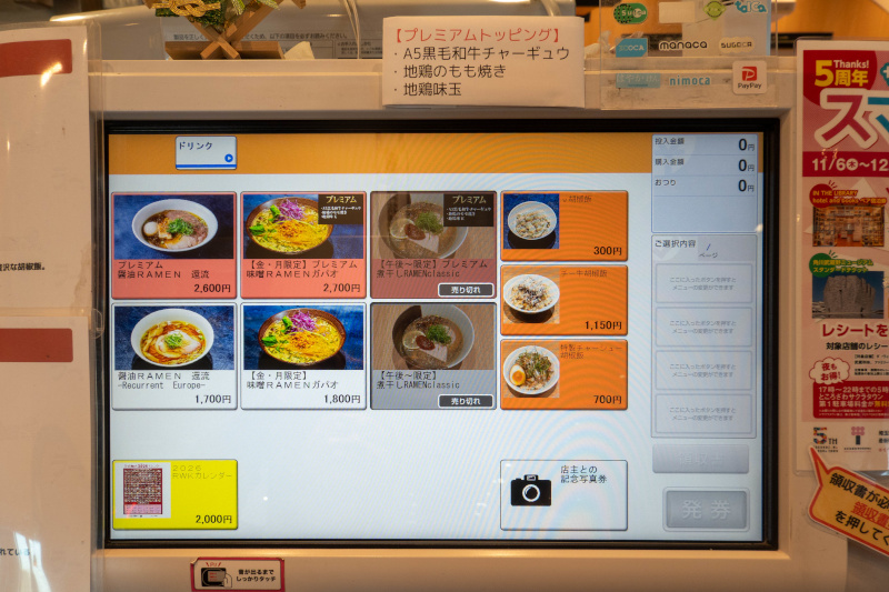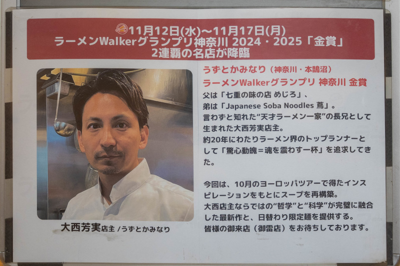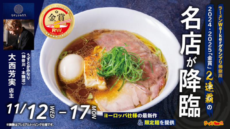 【うずとかみなり】 11月12日~11月17日 ラーメンWalkerグランプリ神奈川 2024・2025「金賞」2連覇の名店が降臨 ヨーロッパ仕様の最新作&限定麺を提供 [2025/11/17] ※ プレミアムトッピング : A5黒毛和牛、地鶏のもも焼き、地鶏味玉 醤油RAMEN 還流 - Recurrent Europe- 1200 [2025/11/17]、プレミアム 2600 (金・月限定) 味噌RAMENガパオ1800、プレミアム 2700 胡椒飯 300、特製チャーシュー胡椒飯 700、チー牛胡椒飯 1150 店主との記念写真券 無料 アサヒ生 ジョッキ缶 450、レモンサワー・ハイボール 400 紹興酒 700、グラスワイン 赤/白 500 (ノンアルコールビール)アサヒドライゼロ 300 コカコーラ・オレンジジュース 200、黒烏龍茶 300 2026 ラーメンWalkerキッチン カレンダー 2000