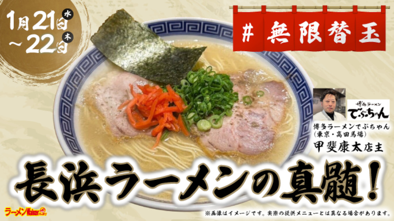 【博多ラーメン でぶちゃん】 長浜ラーメンの真髄! 2026/1/21・22の出店 [2026/1/21] 長浜ラーメン 1200 [2026/1/21]・茹で卵入り 1300・ネギ増し 1400・肉増し 1600 替え玉 無料 明太子ごはん 500 店主との記念写真券 無料 ラーメンWalker2026 カレンダー 2000 アサヒ生 ジョッキ缶 450、レモンサワー・ハイボール 400 紹興酒 700、グラスワイン 赤/白 500 (ノンアルコールビール)アサヒドライゼロ 300 コカコーラ・オレンジジュース 200、黒烏龍茶 300