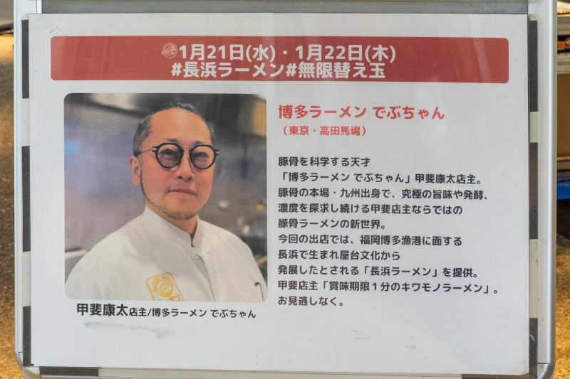 「博多ラーメン でぶちゃん」甲斐康太店主。 豚骨の本場・九州出身で、究極の旨味や発酵、濃度を探求し続ける甲斐店主ならではの豚骨ラーメンの新世界。 今回の出店では、福岡博多漁港に面する長浜で生まれ屋台文化から発展したとされる「長浜ラーメン」を提供。 甲斐店主「賞味期限1分のキワモノラーメン」。お見逃しなく。 ■長浜ラーメン 【長浜ラーメンとは?】