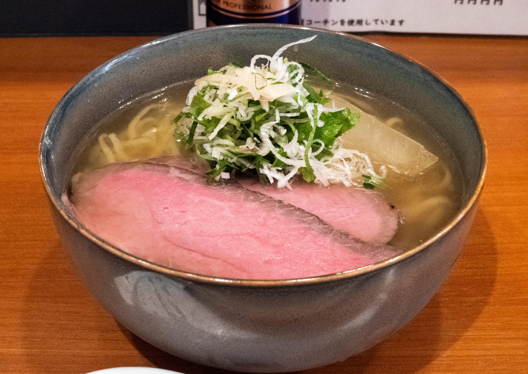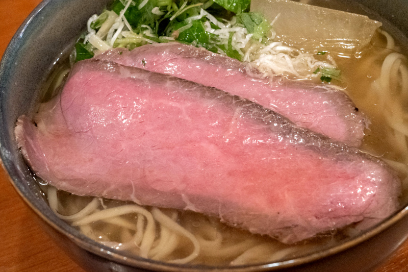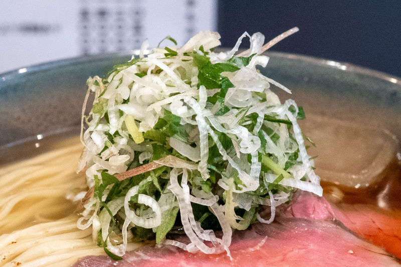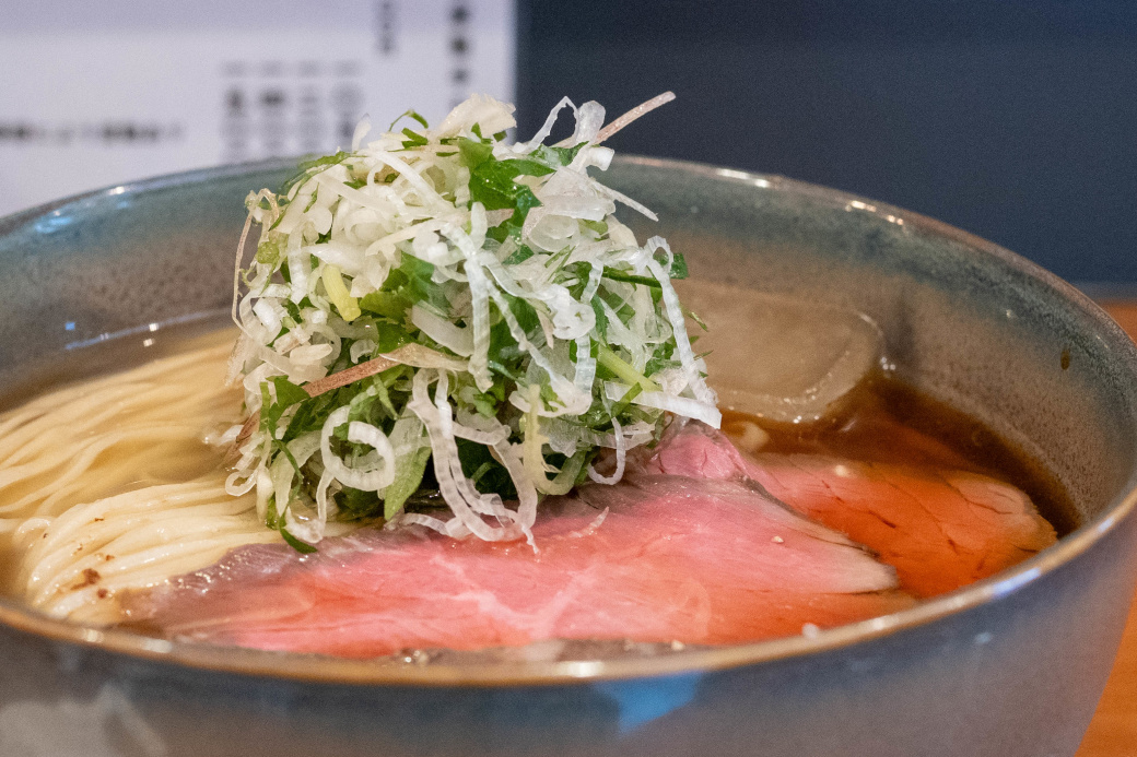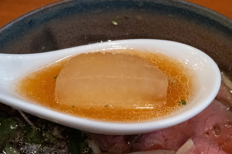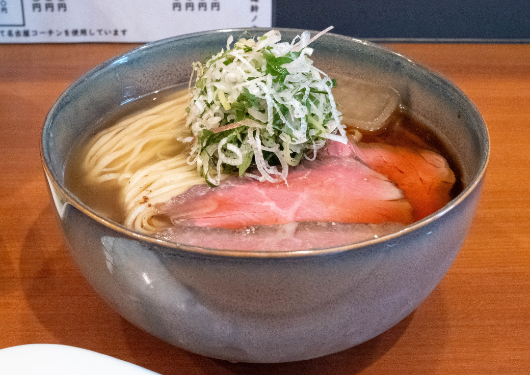 (同じ印象はコピペ) 透明感のある醤油スープは、キンキンに冷えている。 伊吹いりこ、鰺煮干しのクッキリとした旨味と香りがある。 味付けは塩ベースで甘みがあり、塩分が強すぎずにまろやか。 醤油よりもダシ感をダイレクトに感じ、醤油とは違う美味しさがある。個人的には塩も好み。 表面には多めの油が浮いて、適度なアクセントになっている。 ダシ氷も煮干しがしっかりで、食べ終わるまで冷えたままで、スープが薄まることがない。 麺は平打ちストレート。テポで茹でた後に冷水でしっかりと冷やしてある。 滑らかでツルッとした口当たりと、押し返すような強さとしなやかさがあり、さらに美味しくなった印象。 小麦の香りと甘みがあり、麺そのものが美味しい。 (自家製麺) ローストビーフは前回より大きくなり3枚から2枚に。 低温ローストで、牛肉の旨味がある。 薬味は、みょうが、大葉、三つ葉、白髪ネギ。 茗荷と大葉の味わいが涼しげで、冷たいスープに良く合っている。 〆茶漬けセットは、ご飯に五色あられ・海苔・山葵をトッピングして、冷たいスープを注いでお茶漬けに。 温かいご飯に合わせると、スープは違った表情を見せる。 ご飯との相性は抜群に良い。 暑い夏にピッタリの一杯! |