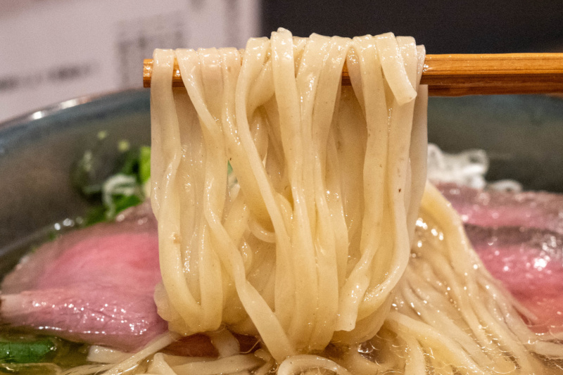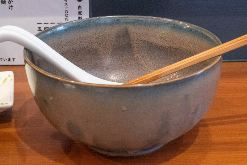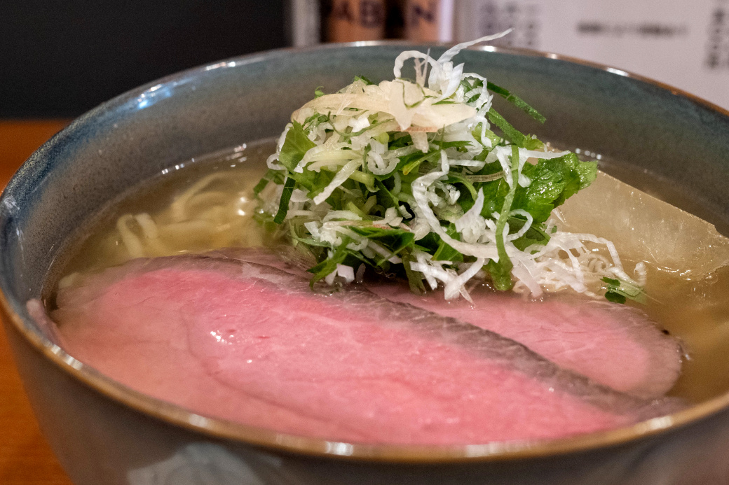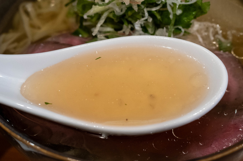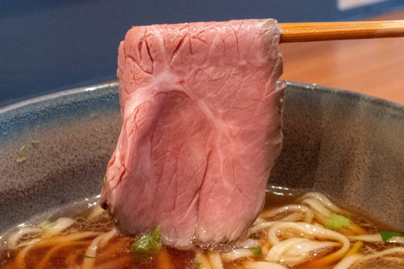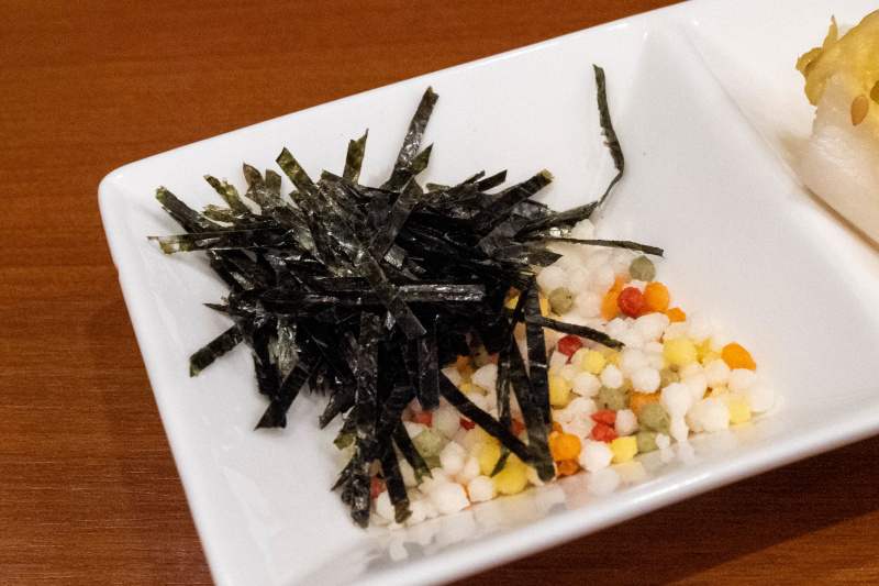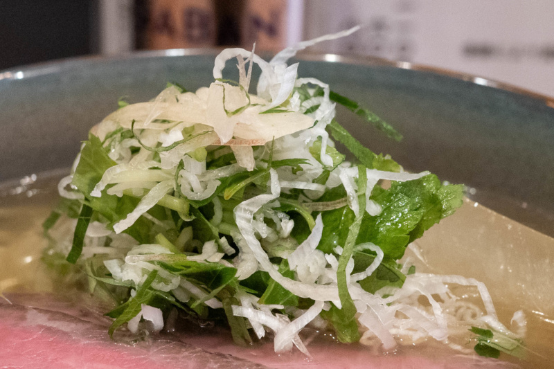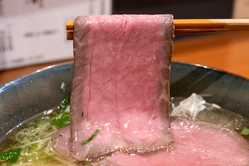(同じ印象はコピペ) 透明感のある醤油スープは、キンキンに冷えている。 伊吹いりこ、鰺煮干しのクッキリとした旨味と香りがある。 味付けは塩ベースで甘みがあり、塩分が強すぎずにまろやか。 醤油よりもダシ感をダイレクトに感じ、醤油とは違う美味しさがある。個人的には塩も好み。 表面には多めの油が浮いて、適度なアクセントになっている。 ダシ氷も煮干しがしっかりで、食べ終わるまで冷えたままで、スープが薄まることがない。 麺は平打ちストレート。テポで茹でた後に冷水でしっかりと冷やしてある。 滑らかでツルッとした口当たりと、押し返すような強さとしなやかさがあり、さらに美味しくなった印象。 小麦の香りと甘みがあり、麺そのものが美味しい。 (自家製麺) ローストビーフは前回より大きくなり3枚から2枚に。 低温ローストで、牛肉の旨味がある。 薬味は、みょうが、大葉、三つ葉、白髪ネギ。 茗荷と大葉の味わいが涼しげで、冷たいスープに良く合っている。 〆茶漬けセットは、ご飯に五色あられ・海苔・山葵をトッピングして、冷たいスープを注いでお茶漬けに。 温かいご飯に合わせると、スープは違った表情を見せる。 ご飯との相性は抜群に良い。 暑い夏にピッタリの一杯! |