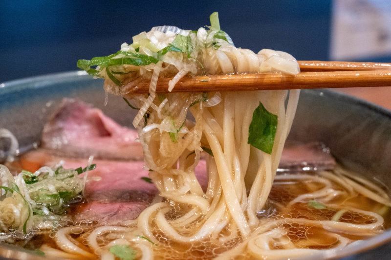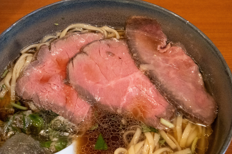 (同じ印象はコピペ) 透明感のある醤油スープは、キンキンに冷えている。 伊吹いりこ、鰺煮干しのクッキリとした旨味と香りがある。 味付けは醤油ベースで甘みがあり、塩分が強すぎずにまろやか。 魚系ダシと醤油の相性が非常に良く、塩とは違う美味しさがある。個人的には醤油も好み。 表面には多めの油が浮いて、適度なアクセントになっている。 ダシ氷も煮干しがしっかりで、食べ終わるまで冷えたままで、スープが薄まることがない。 麺は平打ちストレート。テポで茹でた後に冷水でしっかりと冷やしてある。 滑らかでツルッとした口当たりと、押し返すような強さとしなやかさがあり、さらに美味しくなった印象。 小麦の香りと甘みがあり、麺そのものが美味しい。 (自家製麺) ローストビーフは大きいものが3枚。 低温ローストで、牛肉の旨味がある。 薬味は、みょうが、大葉、三つ葉、白髪ネギ。 茗荷と大葉の味わいが涼しげで、冷たいスープに良く合っている。 〆茶漬けセットは、ご飯に五色あられ・海苔・山葵をトッピングして、冷たいスープを注いでお茶漬けに。 温かいご飯に合わせると、スープは違った表情を見せる。 ご飯との相性は抜群に良い。 暑い夏にピッタリの一杯! |