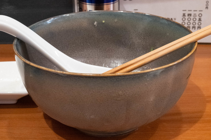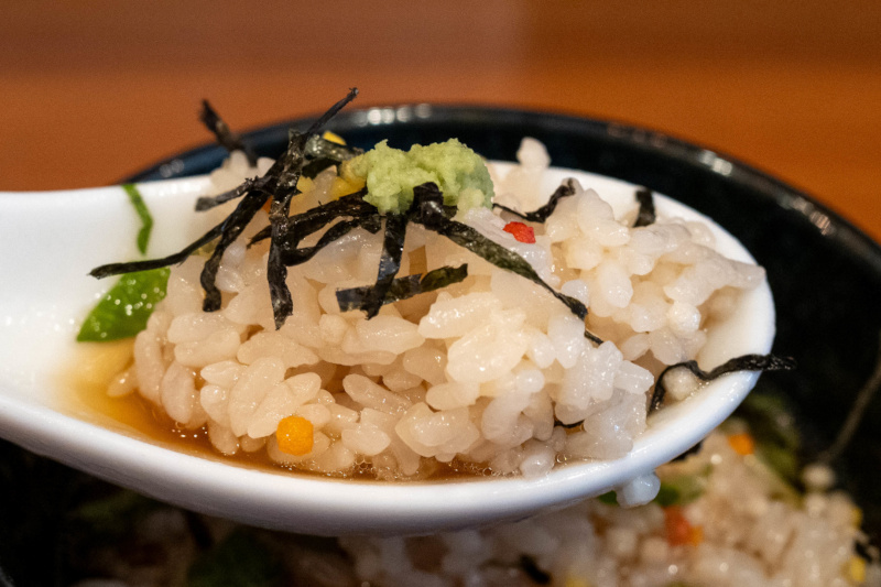透明感のある醤油スープは、キンキンに冷えている。 伊吹いりこ、鰺煮干しのクッキリとした旨味と香りがある。 味付けは醤油ベースで甘みがあり、塩分が強すぎずにまろやか。 魚系ダシと醤油の相性が非常に良く、塩とは違う美味しさがある。個人的には醤油も好み。 表面には多めの油が浮いて、適度なアクセントになっている。 ダシ氷も煮干しがしっかりで、食べ終わるまで冷えたままで、スープが薄まることがない。 麺は平打ちストレート。テポで茹でた後に冷水でしっかりと冷やしてある。 滑らかでツルッとした口当たりと、押し返すような強さとしなやかさがあり、さらに美味しくなった印象。 小麦の香りと甘みがあり、麺そのものが美味しい。 (自家製麺) チャーシューは特大のローストビーフが1枚。(昨年のローストビーフは小4枚) 低温ローストで、牛肉の旨味がある。 薬味は、みょうが、大葉、三つ葉、白髪ネギ。 茗荷と大葉の味わいが涼しげで、冷たいスープに良く合っている。 〆茶漬けセットは、ご飯に五色あられ・海苔・山葵をトッピングして、冷たいスープを注いでお茶漬けに。 温かいご飯に合わせると、スープは違った表情を見せる。 ご飯との相性は抜群に良い。 暑い夏にピッタリの一杯! 器が変わって昨年と趣が異なるのも良い |