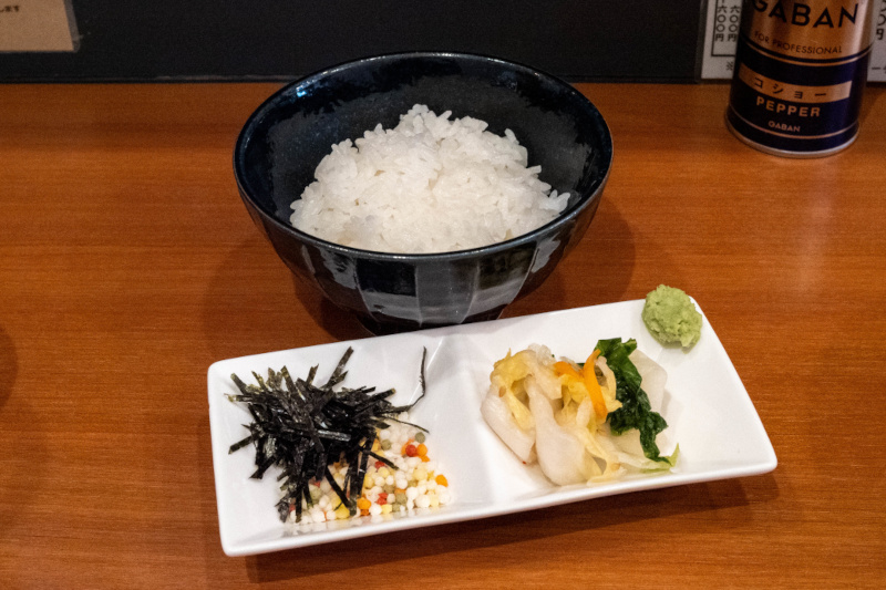 麺は中加水の自家製麺 オーブンで香ばしく焼き上げた豚ロース焼豚やほうれん草などが乗り仕上げにブラックペッパーをふりかけます 麺量は200g (麺増量不可) 濃いめの味付けでご飯が進む味付けなので、山形県産雪若丸使用の【ご飯 ¥200】推奨です |