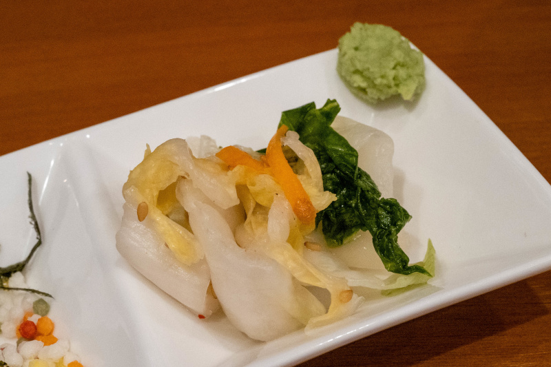 透明感のある醤油スープは、キンキンに冷えている。 伊吹いりこ、鰺煮干しのクッキリとした旨味と香りがある。 味付けは塩ベースで甘みがあり、塩分が強すぎずにまろやか。 醤油よりもダシ感をダイレクトに感じ、醤油とは違う美味しさがある。個人的には塩も好み。 表面には多めの油が浮いて、適度なアクセントになっている。 ダシ氷も煮干しがしっかりで、食べ終わるまで冷えたままで、スープが薄まることがない。 麺は平打ちストレート。テポで茹でた後に冷水でしっかりと冷やしてある。 滑らかでツルッとした口当たりと、押し返すような強さとしなやかさがあり、さらに美味しくなった印象。 小麦の香りと甘みがあり、麺そのものが美味しい。 (自家製麺) チャーシューは大きいローストビーフが2枚。(前回のローストビーフは特大1枚) 低温ローストで、牛肉の旨味がある。 薬味は、みょうが、大葉、三つ葉、白髪ネギ。 茗荷と大葉の味わいが涼しげで、冷たいスープに良く合っている。 〆茶漬けセットは、ご飯に五色あられ・海苔・山葵をトッピングして、冷たいスープを注いでお茶漬けに。 温かいご飯に合わせると、スープは違った表情を見せる。 ご飯との相性は抜群に良い。 暑い夏にピッタリの一杯! |