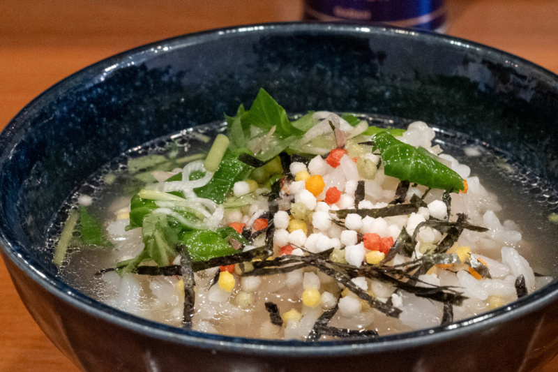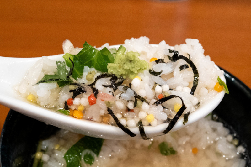 (同じ印象はコピペ) 透明感のある醤油スープは、キンキンに冷えている。 伊吹いりこ、鰺煮干しのクッキリとした旨味と香りがある。 味付けは塩ベースで甘みがあり、塩分が強すぎずにまろやか。 醤油よりもダシ感をダイレクトに感じ、醤油とは違う美味しさがある。個人的には塩も好み。 表面には多めの油が浮いて、適度なアクセントになっている。 ダシ氷も煮干しがしっかりで、食べ終わるまで冷えたままで、スープが薄まることがない。 麺は平打ちストレート。テポで茹でた後に冷水でしっかりと冷やしてある。 滑らかでツルッとした口当たりと、押し返すような強さとしなやかさがあり、さらに美味しくなった印象。 小麦の香りと甘みがあり、麺そのものが美味しい。 (自家製麺) チャーシューは前回同様、大きいローストビーフが2枚。 低温ローストで、牛肉の旨味がある。 薬味は、みょうが、大葉、三つ葉、白髪ネギ。 茗荷と大葉の味わいが涼しげで、冷たいスープに良く合っている。 〆茶漬けセットは、ご飯に五色あられ・海苔・山葵をトッピングして、冷たいスープを注いでお茶漬けに。 温かいご飯に合わせると、スープは違った表情を見せる。 ご飯との相性は抜群に良い。 暑い夏にピッタリの一杯! |