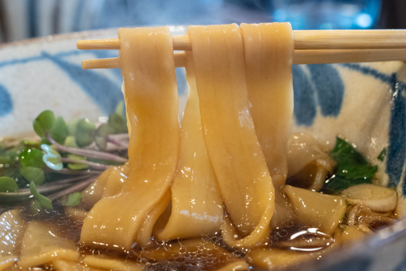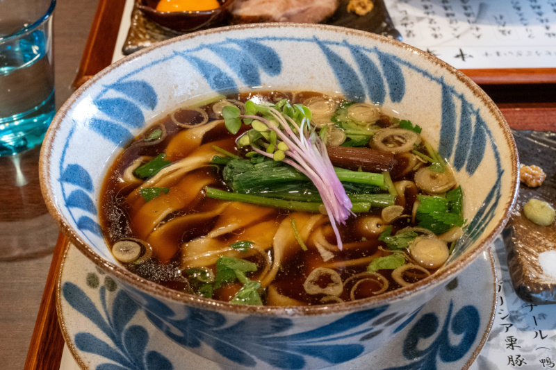 鴨づくしの一杯は麺のインパクトも抜群 スープは鴨と国産丸鶏を贅沢に使った上品な味わい。チャーシューやワンタンなどの具にもこだわる。 超幅広の自家製麺も自慢で、もち小麦とうどん用の小麦粉の生地にmデュラム・セモリナ粉の生地をはさんだ3層構造。外はモチモチ、中はアルデンテだ。 特製中華そば 醤油 ¥1800 醤油ダレは濃口をメインに、肉と相性が良い甘露醤油もブレンド。キリッとした中にほんのりと甘味もある。炭火で炙った鴨と鶏ムネ、豚肩ロースなどが別皿で提供される。 麺:極太/平打/ストレート 160g 自家製麺 スープ 種類:鴨・丸鶏