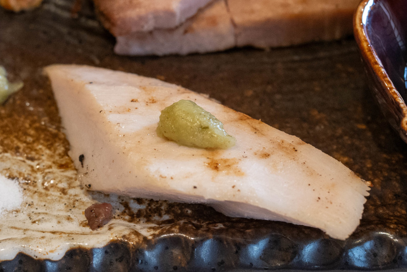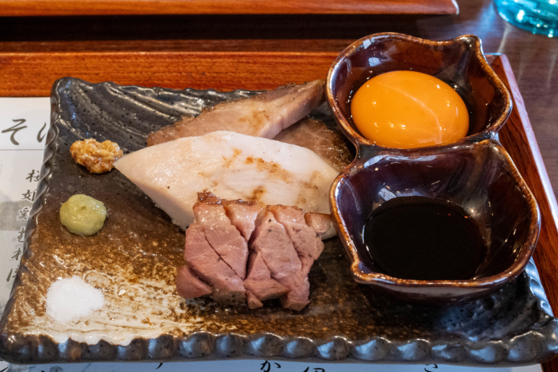 中華そば 塩 [2025/4/30] ¥1600 *** 中華そば *** 動物系は鴨と軍鶏で、表面の油は鴨。そこに煮干しなどの和風乾物系が加わる。 それぞれの素材が主張し過ぎないバランス重視のスープで、ダシ感や香ばしさを重視したまろやかで奥深さのある塩味。 表面の油は多めだが、しつこさは感じない。 ほんのり胡椒が効いていて、ちょうど良いアクセントになっている。 麺は丸めの太麺で、醤油と同じ3層構造麺 (肉眼では確認できないが)。 セモリナ粉の生地を、もち姫・さぬきの夢の生地でサンドしてある。 もちもちとした食感に、中心部はアルデンテのようなコシのある仕上がりになっている。 スープとの相性が抜群に良い。 (自家製麺) 特製と比べると、チャーシュー(四元豚バラの煮豚2枚)とワンタン(肉ワンタン2個)が入らない。 メンマは太く濃い色、サクッとした歯切れ感があり風味が良い。 小松菜はシャキシャキと瑞々しい。 薬味は、紫キャベツのスプラウト、長ネギの小口切り、三つ葉。 *** 別皿トッピング *** チャーシューなどは別皿で、特製に比べてやや少量になる(はずだが、特製の量のように感じる)。 添えてある薬味は、マスタード、わさび、塩、醤油ベースのたれ。 ハンガリー産マグレカナール鴨肉 : しっかりとした歯応えで、噛みしめるたびに旨味が染み出してくる印象。 桜姫鶏のむね肉 : しっとりとした柔らかさと、銘柄鶏らしい旨さ。 ガリシア栗豚肩ロース : ローストポークで脂身が少なく、赤身の旨さが特筆。 濃紅卵の卵黄 : 濃厚な黄身の旨さ、鴨肉や麺を漬けても美味しい。 中華そばの満足度はもちろん、別皿の鴨などの旨さが加わり、極めて満足度が高い! 《使用食材》