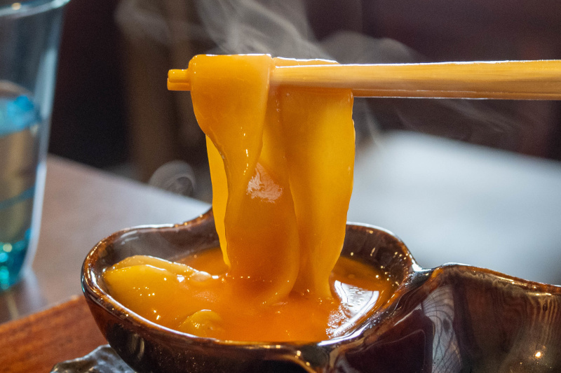 麺を卵黄に漬けて |