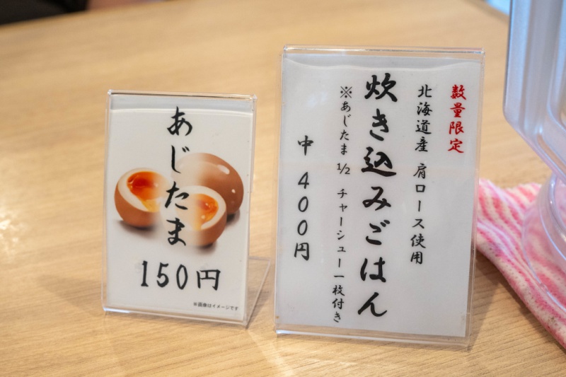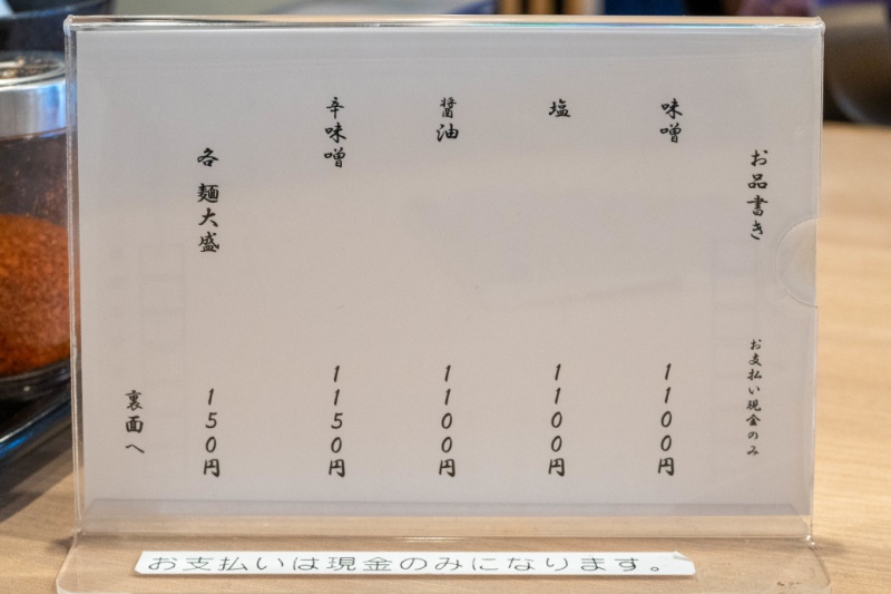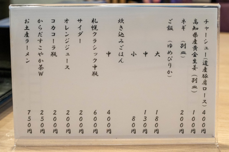 味噌 [2025/9/19] 1100 塩 1100 醤油 1100 辛味噌 1150 大盛 +150 高知県産 黄金生姜(別皿) 100 あじたま 150 ネギ(別皿) 200 チャーシュー 400 (遺産豚肩ロース) ご飯(ゆめぴりか) 小 80/中 130/大 180 炊き込みごはん 400 (あじたま1/2、チャーシュー1枚付き) お土産ラーメン 750 サッポロクラシック 中瓶 600 サイダー・オレンジジュース・コカコーラ瓶 200、からだすこやか茶W 250 |