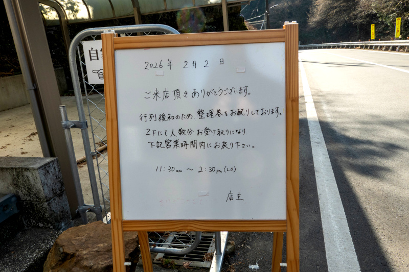 住所 西多摩郡日の出町大久野4593 GARAGE JIRAIGEN 2F [地図] 電話番号不明 営業時間 11:30~14:30 不定休 (Instagram・Xで営業日を告知) 駐車場 7台 最寄り駅は JR五日市線 武蔵五日市駅 または JR青梅線 青梅駅だが、どちらからでも7km以上ある 公共交通機関でのアクセス方法 JR五日市線 武蔵五日市駅から 西東京バス 「つるつる温泉行」~「松尾」バス停下車 約15分、下車すぐ (土曜・休日のみ) JR青梅線 青梅駅から 西東京バス 「つるつる温泉行」~「松尾」バス停下車 約15分、下車すぐ カウンタ 1席+1席、テーブル 2席×3,4席×1 前金制 (PayPay支払い可) ※ 2026/2/23から整理券制(60食限定)となり、当日朝10時から店舗で配布する (整理券は、時間指定はなし、営業時間中ならいつでも訪問可) 2025/5/24 オープン 店主は、地雷源創業者 鯉谷剛至氏 [Instagram] [X] 外観撮影 2026/3/27 |