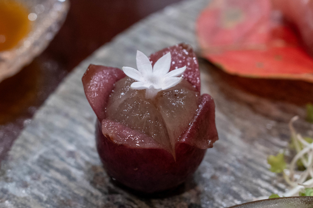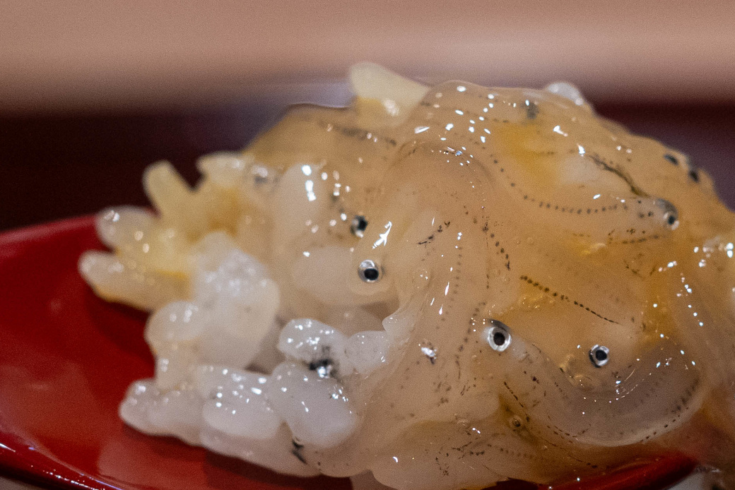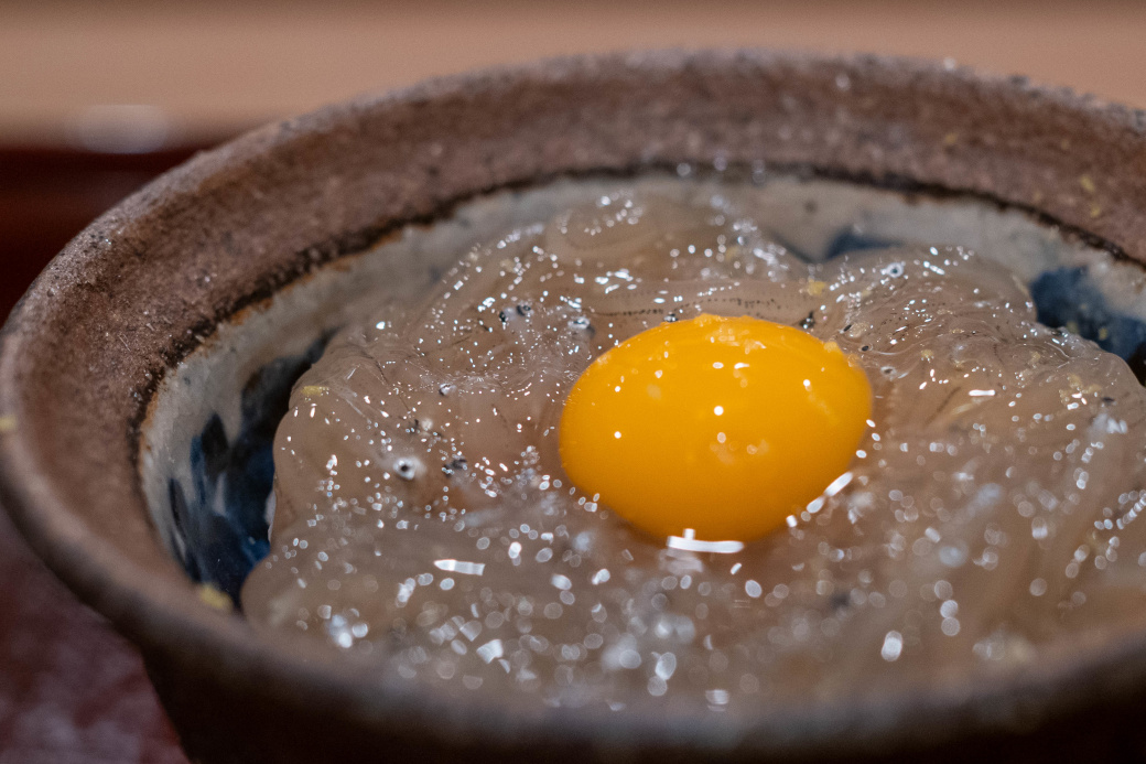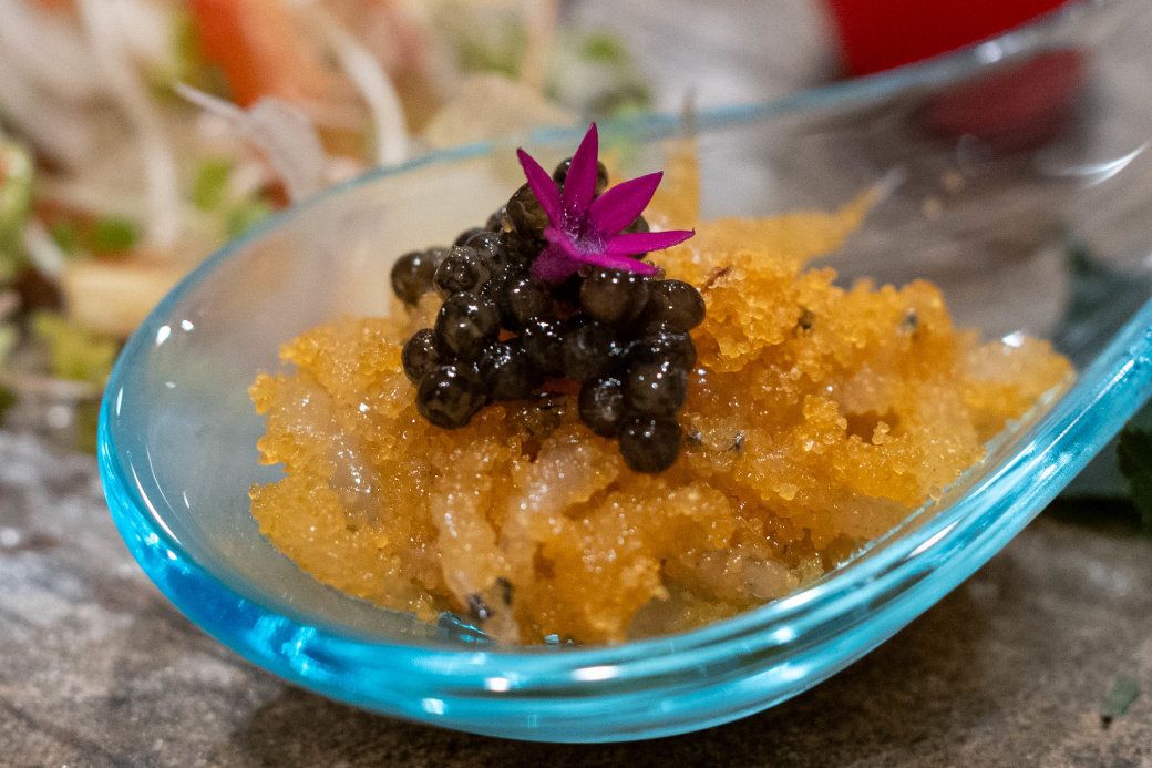茨城県産 白魚 唐墨和え・キャビア・ペンタス(紫) |