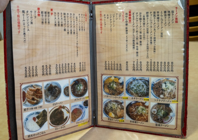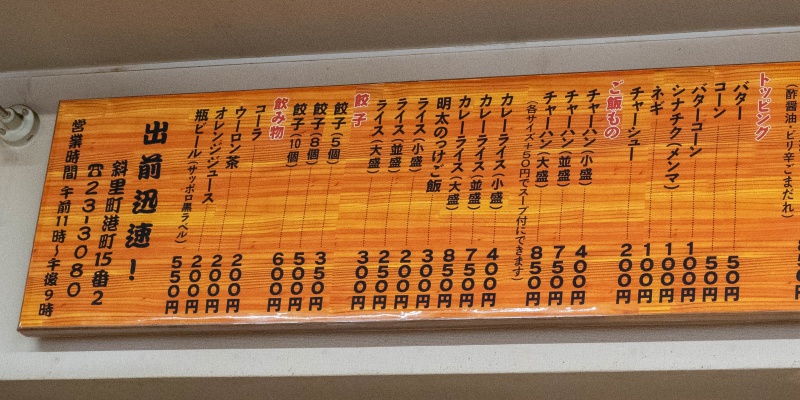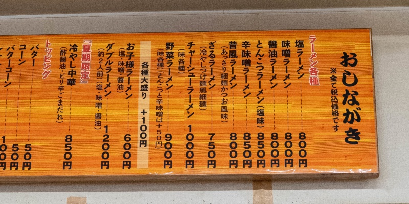 塩ラーメン [2025/9/21] 800 味噌ラーメン [2025/9/21] 800 醤油ラーメン 800 とんこつラーメン (塩味) 850 辛味噌ラーメン 850 昔風ラーメン (あっさり細麺かつお風味) 800 チャーシューラーメン (味各種) 1000 野菜ラーメン (味各種、とんこつと辛味噌は +50) 900 大盛り +100 お子様ラーメン (塩・味噌・醤油) 600 ダブルラーメン (約2人前、塩・味噌・醤油) 1200 ざるラーメン (冷やしつけ麺風細麺) 750 [夏期限定] 冷やし中華 (酢醤油・ピリ辛ごまだれ) 850 バター・コーン 50、バターコーン 100、シナチク(メンマ)・ネギ 100、チャーシュー 200 チャーハン 小盛 [2025/9/21] 400/並盛 750/大盛 850 (スープ付き +50) カレーライス 小盛 400/並盛 750/大盛 850 明太のっけご飯 300 ライス 小盛 200/並盛 250/大盛 300 餃子 5個 350/8個 500/10個 600 瓶ビール (サッポロ黒ラベル) 550 コーラ・ウーロン茶・オレンジジュース 200 |