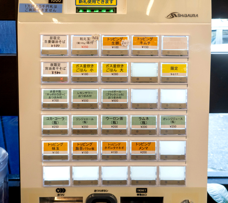 [2025/12/9] 昼限定 生姜醤油そば 980 [2025/12/9] 夜限定 背脂煮干そば 980 和え玉(細麺) 140g 250 生卵 100、キムチ・味玉 [2025/12/9]・ネギ・タマネギ・海苔 バラor板 150、メンマ 200 ガス釜炊きごはん 小 180・大 280 [本日の限定]